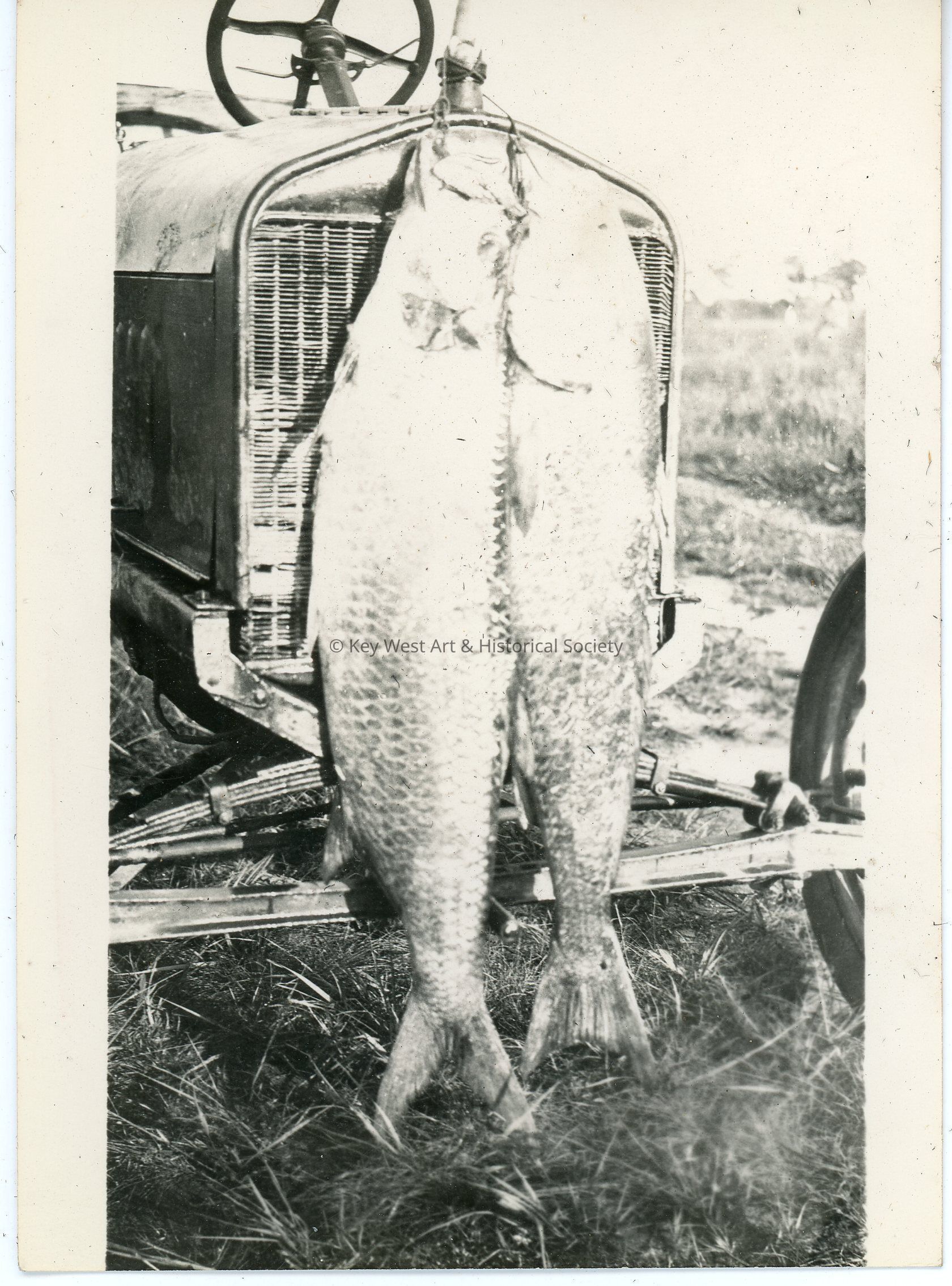 Black and white photograph of two (2) fish hanging on a car or tractor grill. The photo was part of a photograph album began by Victor H. Baker in 1940.