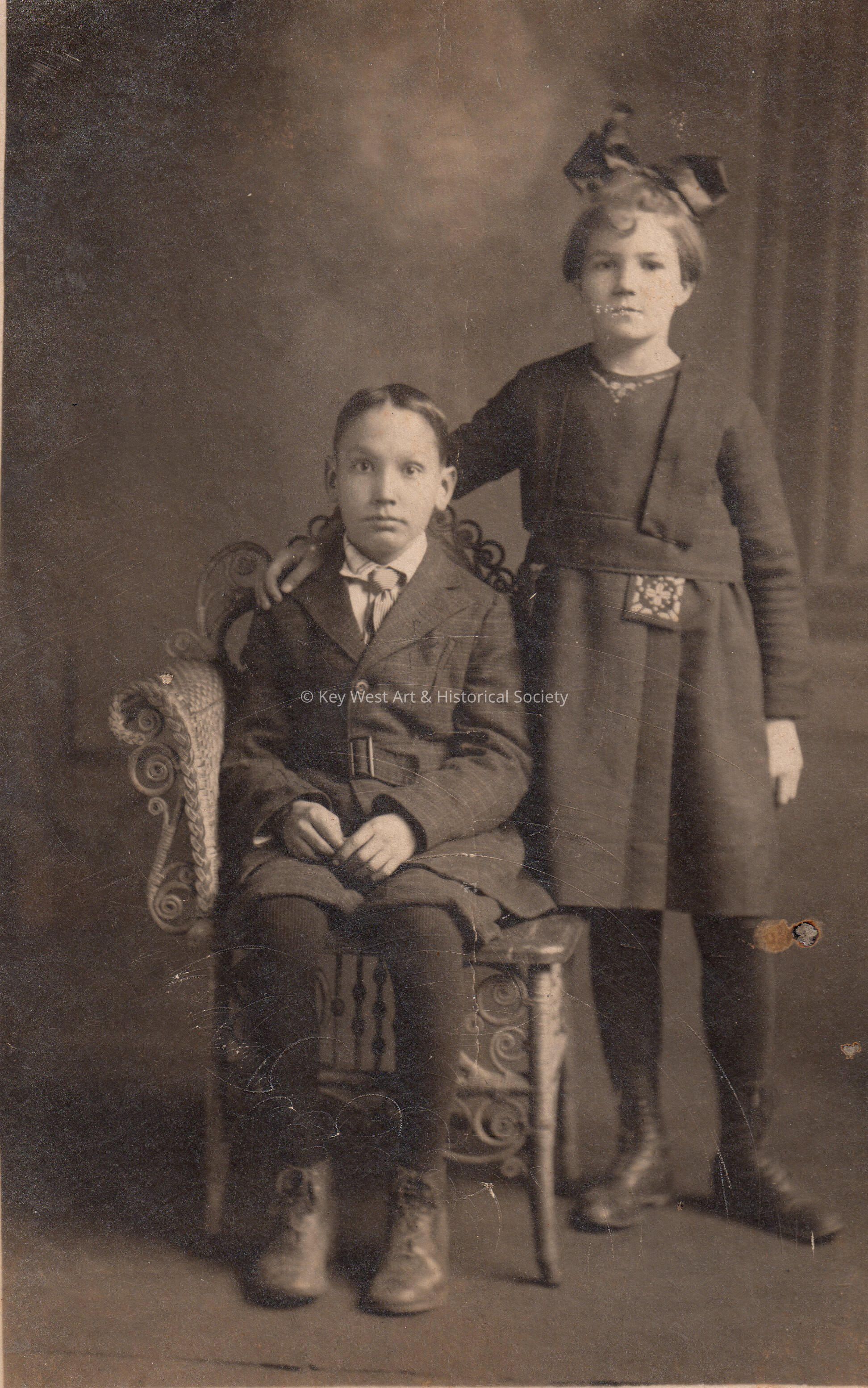 Postcard of two children in formal pose with a note that reads: "Callie Imojene Gentry 10 or 12; Born July 8, 1909, Cedartown, GA".Collection