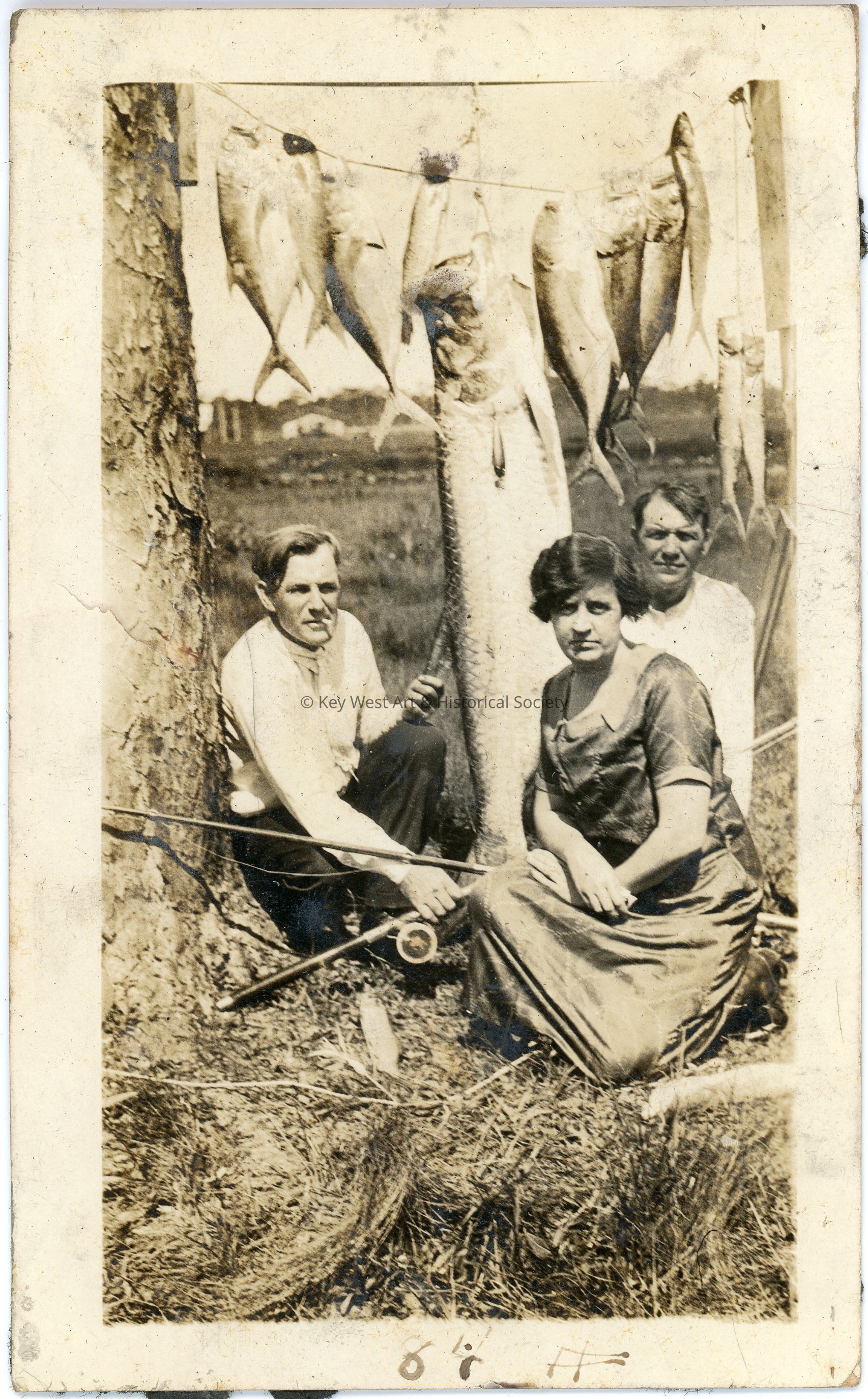 Black and white photograph of two men and a woman crouching in front of multiple hanging fish. The photo was part of a photograph album began by Victor H. Baker in 1940.