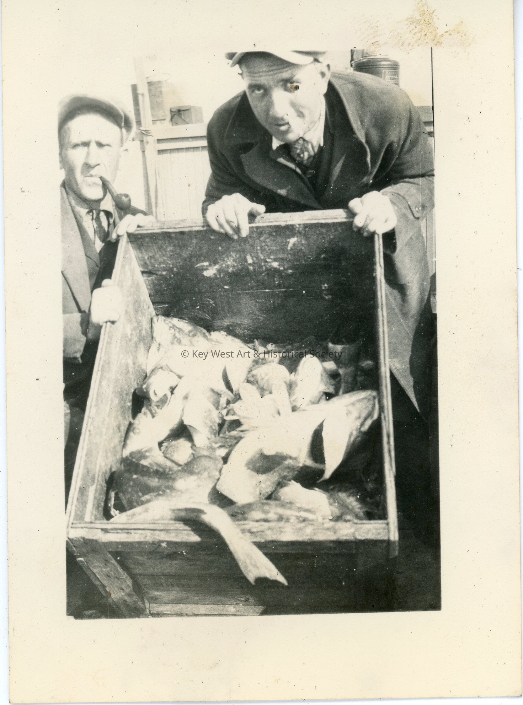 Black and white photograph of two unknown men showing off a wooden crate full of fish. The photo was part of a photograph album began by Victor H. Baker in 1940.