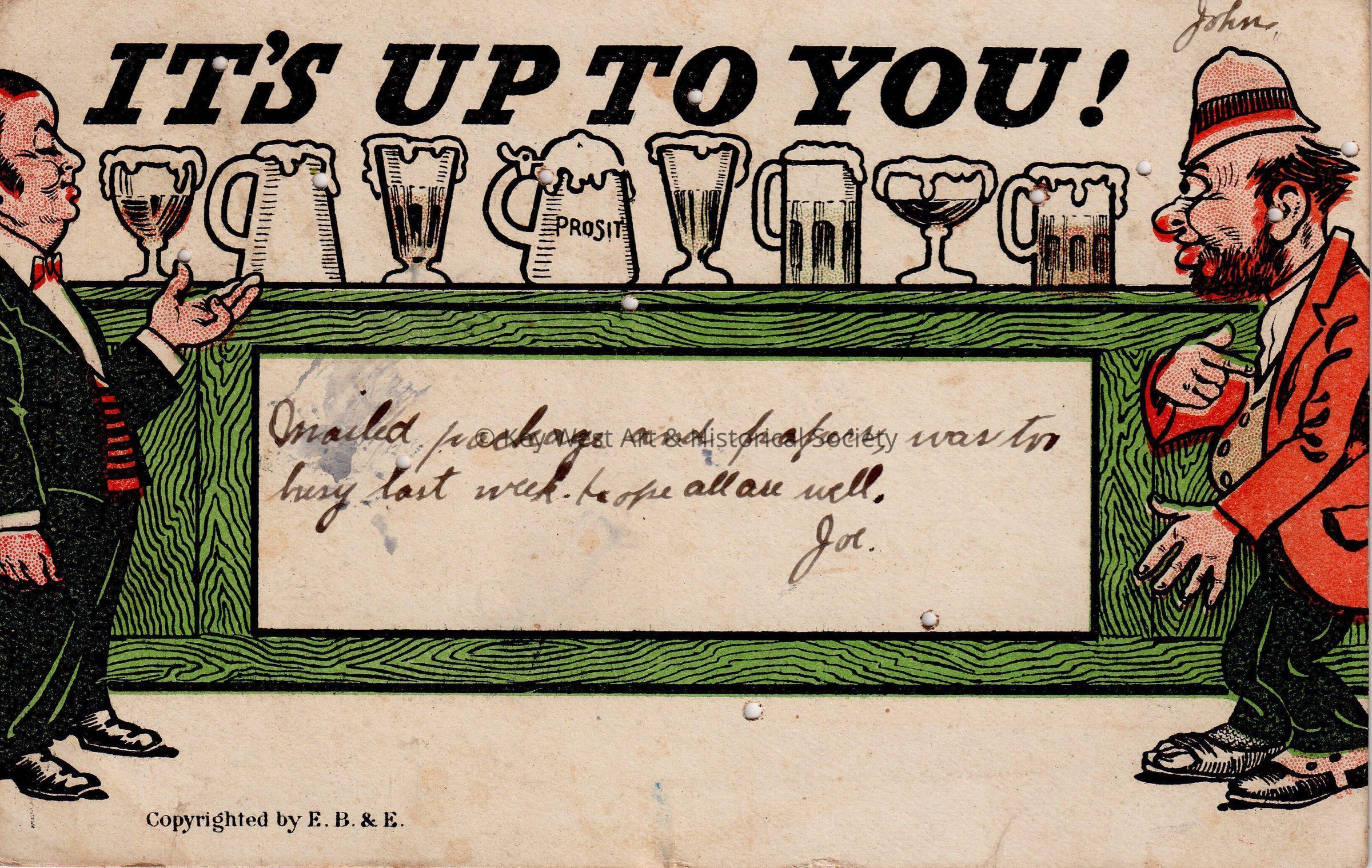 Postcard depicting a well-dressed man offering a bar full of drinks to a poor man. The caption reads, ‘It’s Up To You!’ The message on the front reads, ‘John, Mailed package and papers, was too busy last week. Hope all are well. Joe.’ The card is addressed to Mr. John W. Hattrick, 2012 Latona Street, Southwest Station, Philadelphia, Pennsylvania, and is postmarked Key West, April 1, 1907.Collection