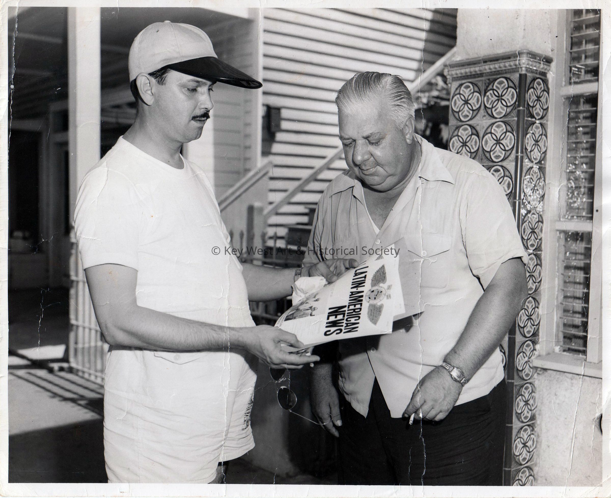 Black and white photograph of two unknown men carrying copies of Latin American News.
