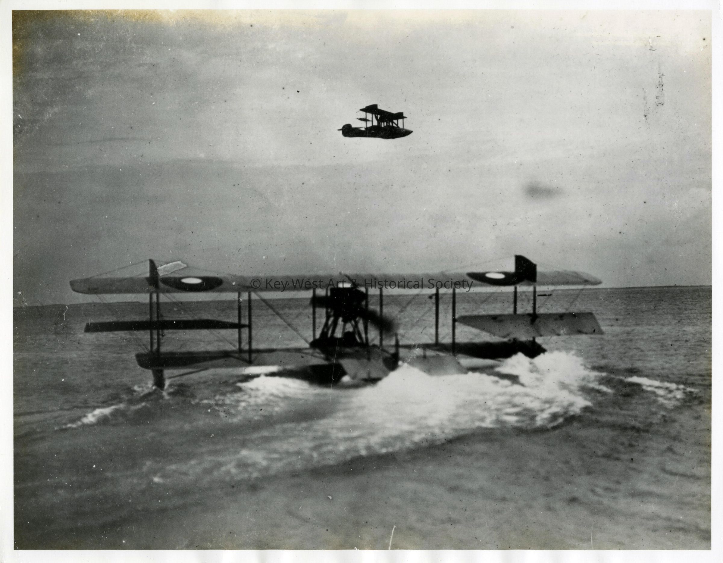 Black and white photograph of two U.S. Navy seaplanes in Key West Harbor during World War I.
