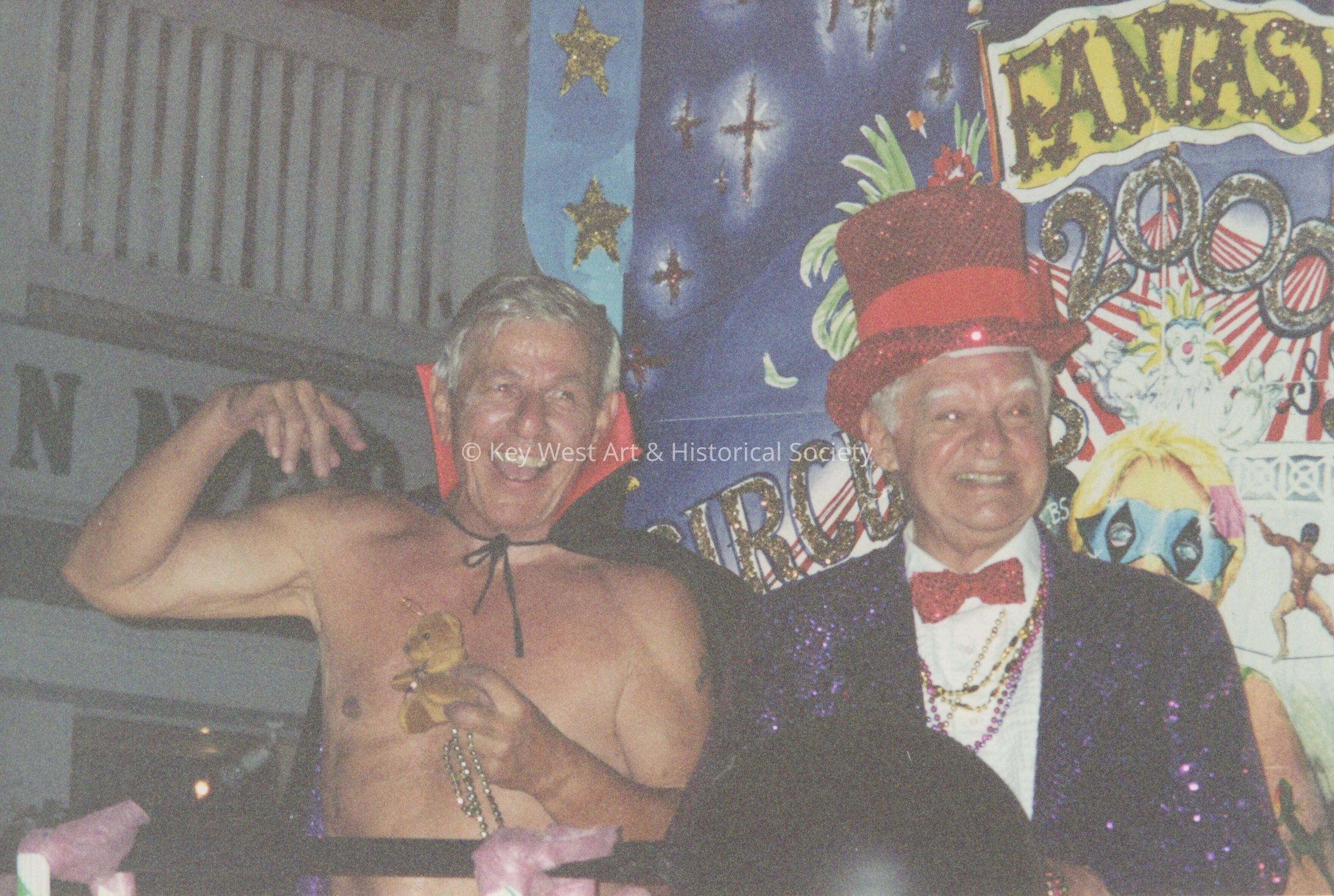 Two unknown men dressed up on a float.