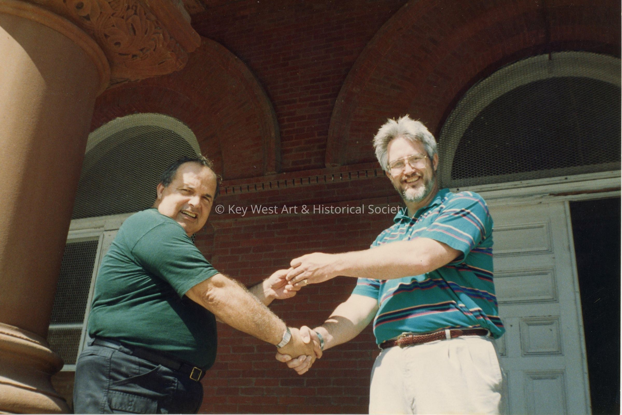 Two unknown men shaking hands standing outside.Entry/Object ID