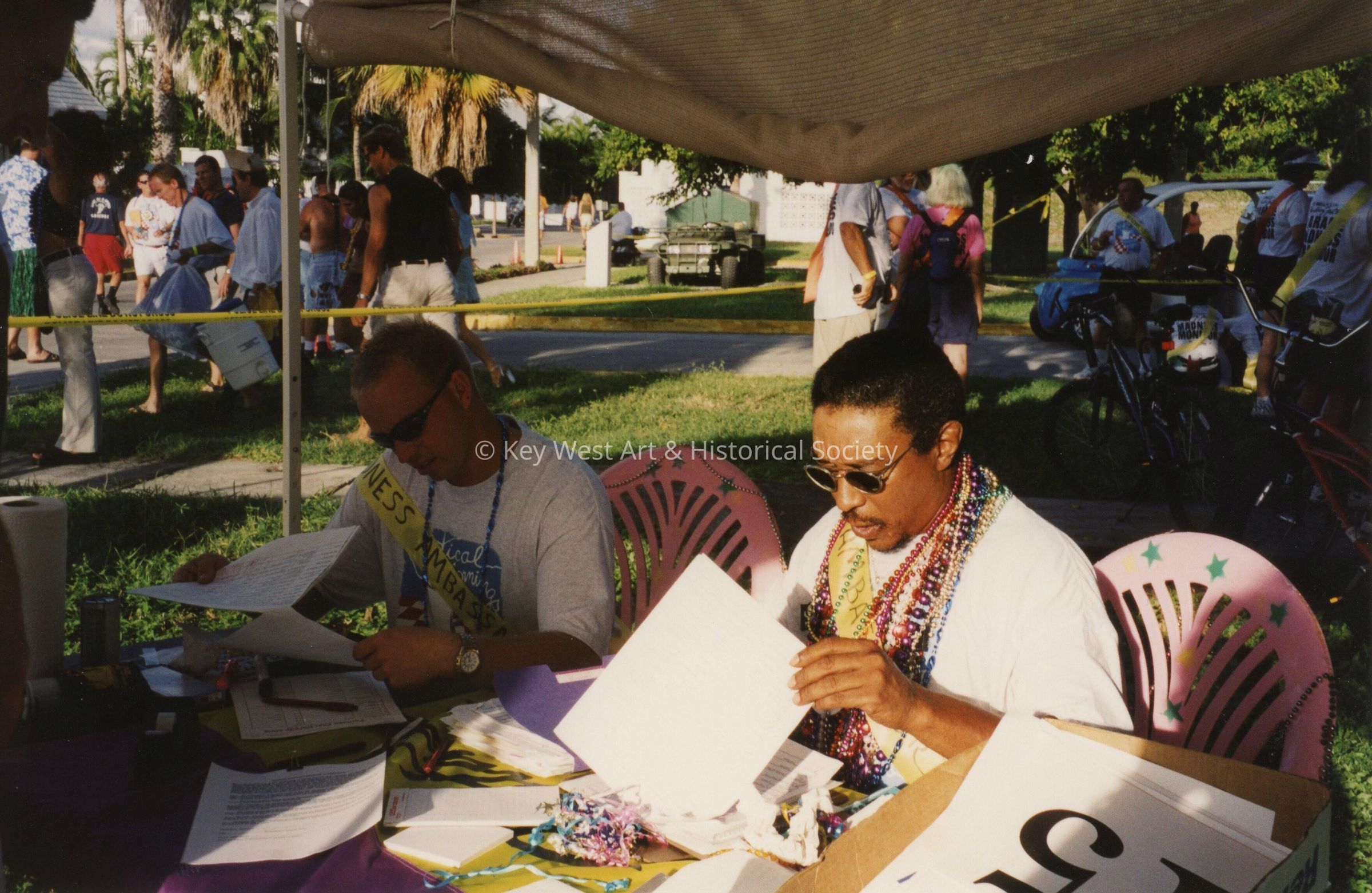 Two unknown men sitting at a table looking at paper work.Entry/Object ID