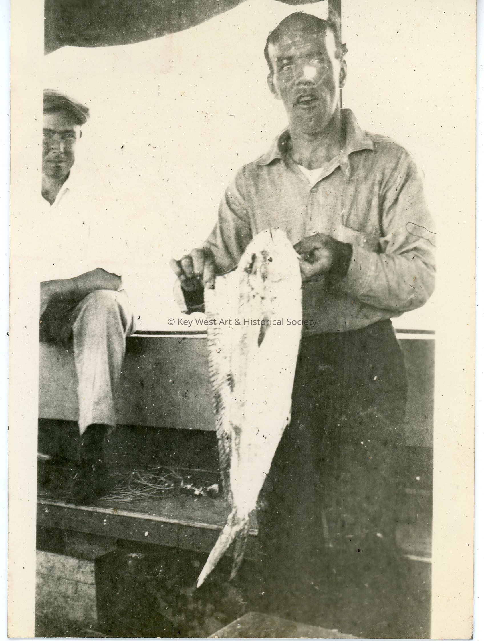 Black and white photograph of an unknown man holding a mahi mahi. A second man seated in the background. The photo was part of a photograph album began by Victor H. Baker in 1940.