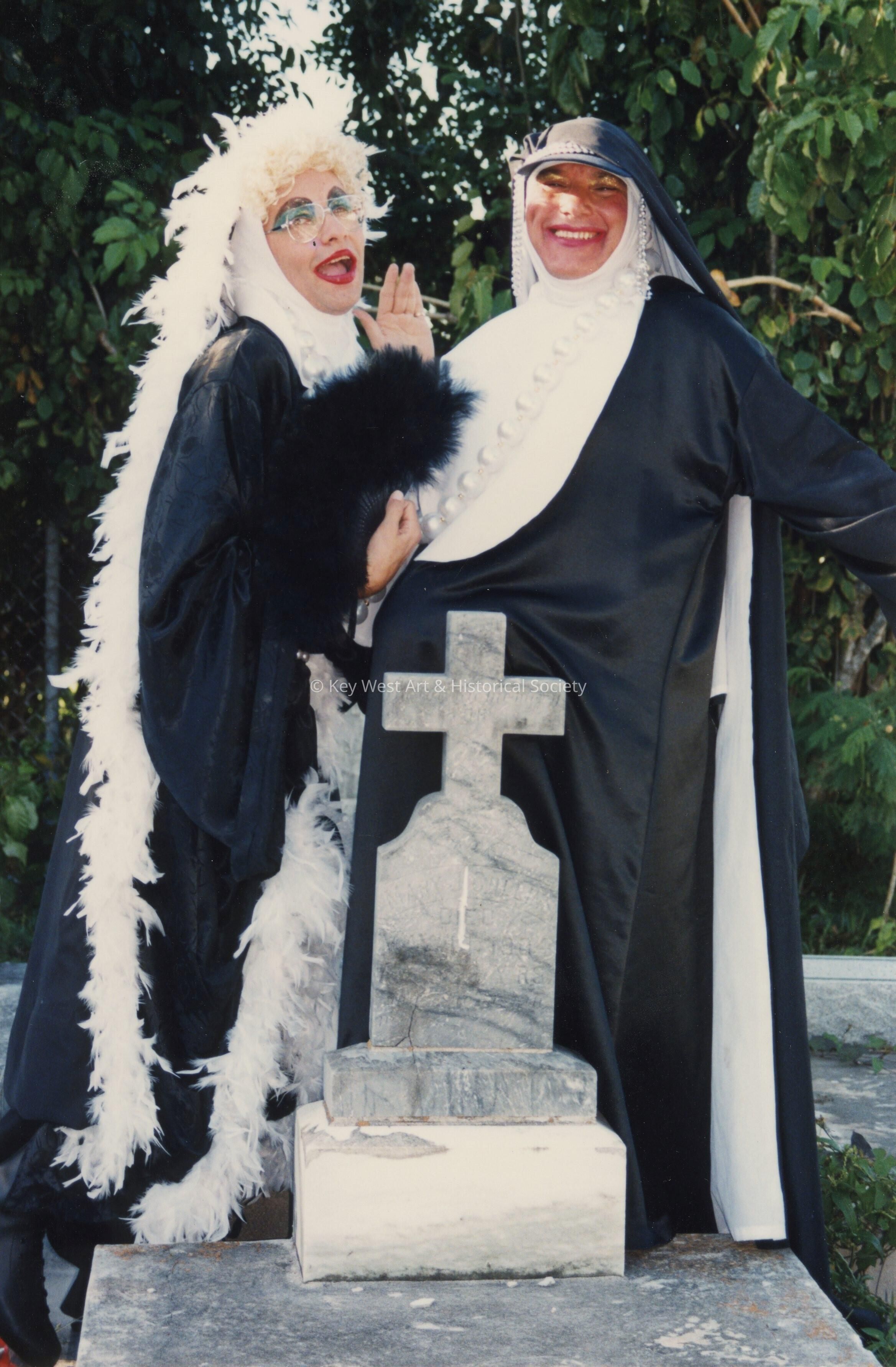 Two unknown people dressed up and standing a the cemetery.Entry/Object ID