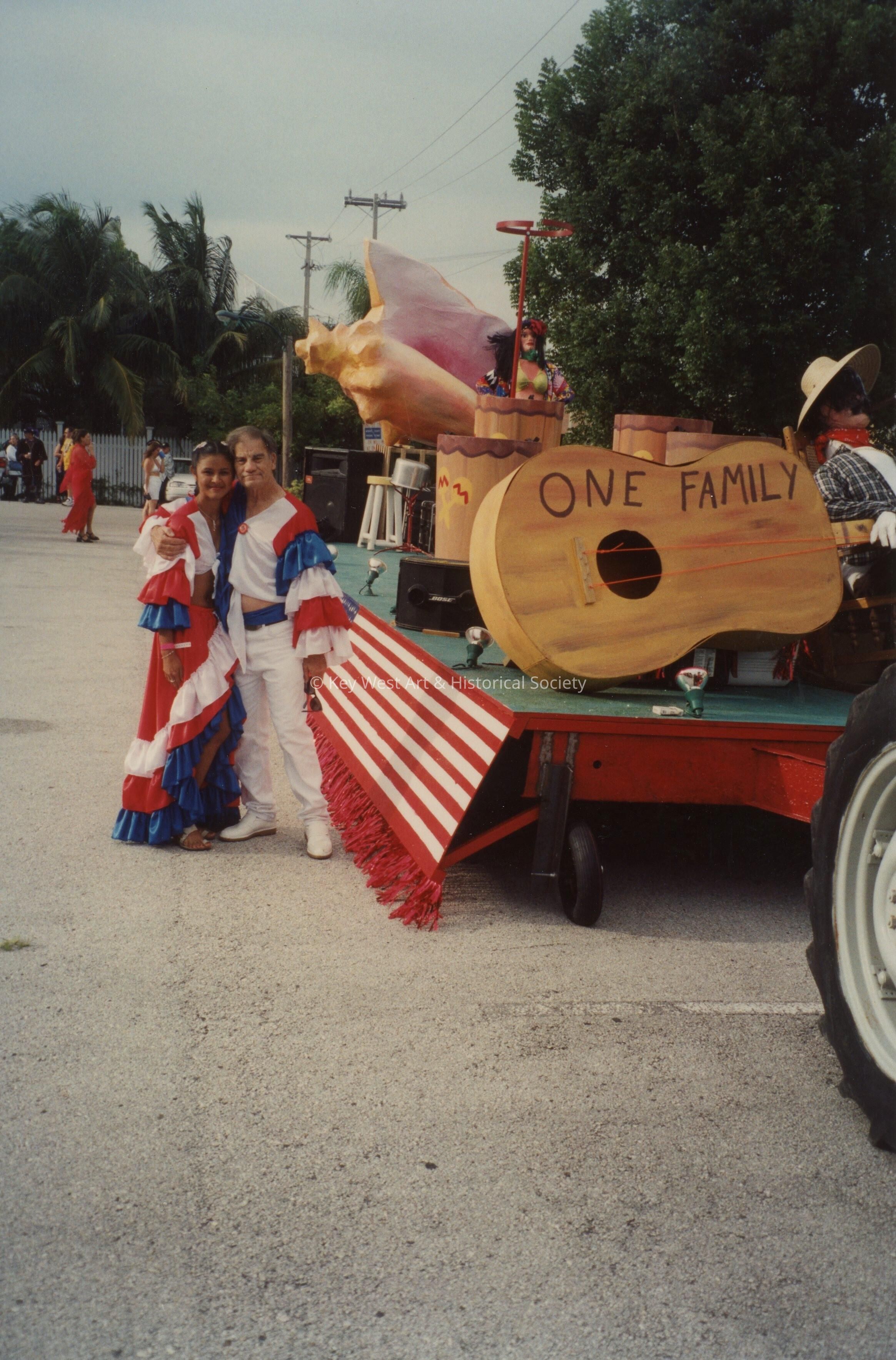Two unknown people dressed up standing near a float.Entry/Object ID