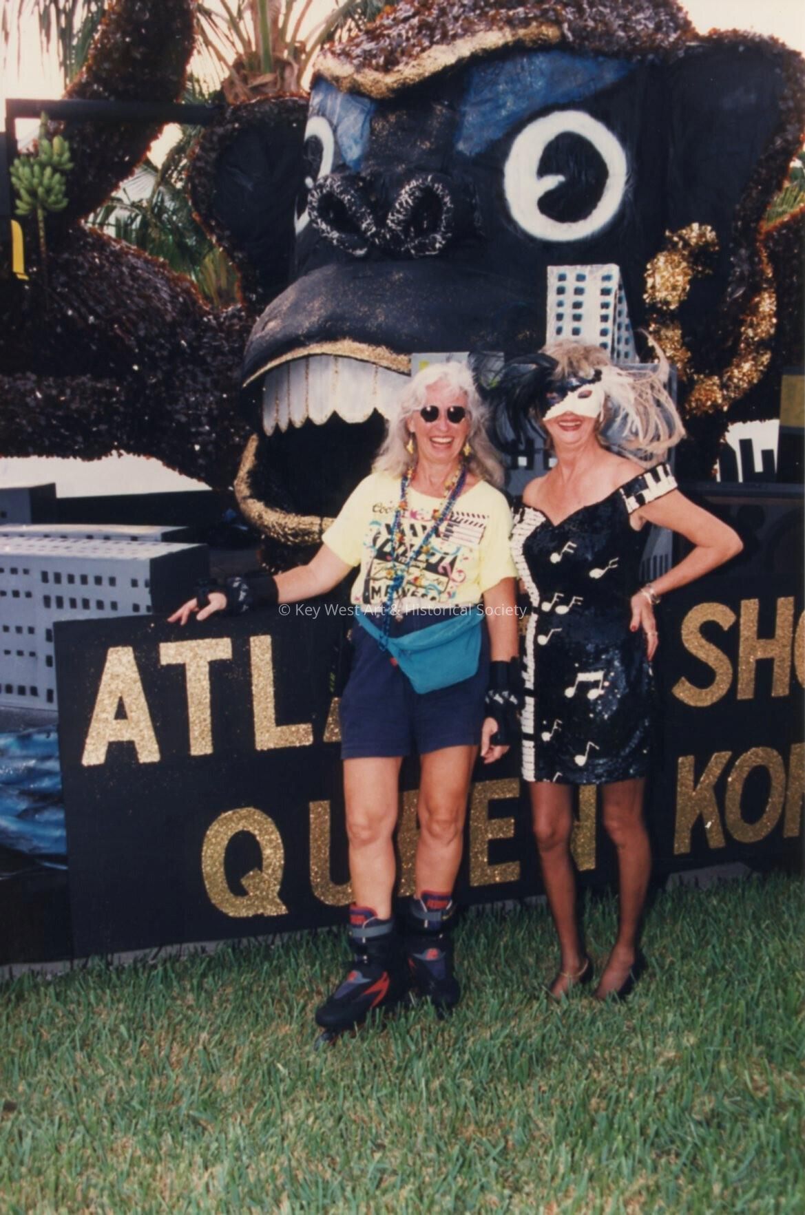 Two unknown woman dressed up standing next to a float.Collection