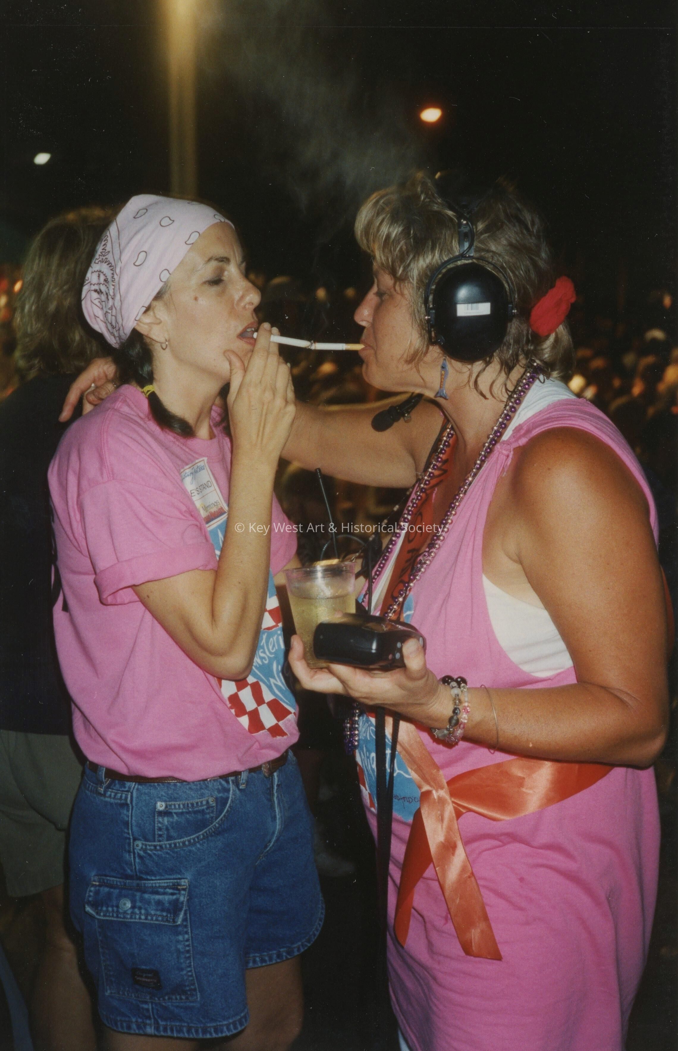 Two unknown woman lighting cigarettes.
