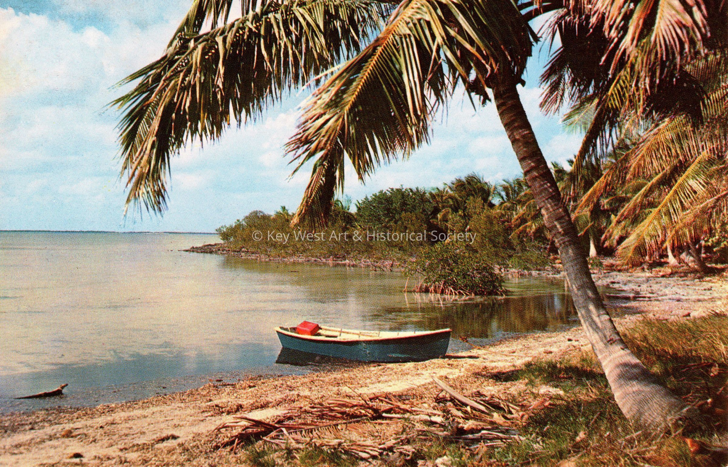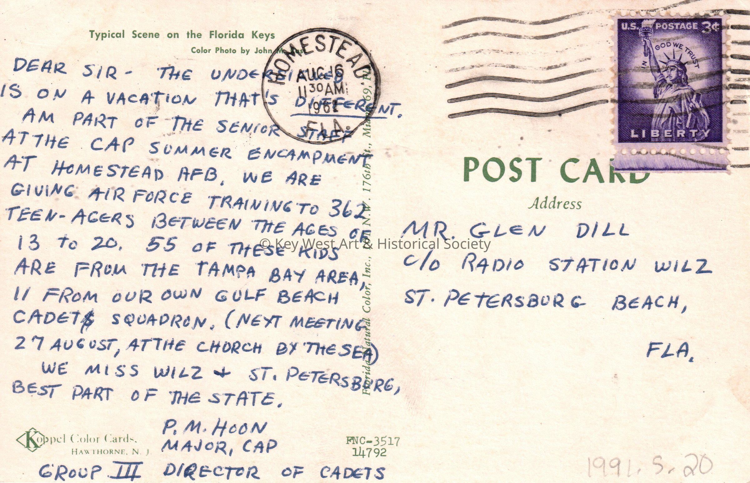 Postcard depicting a small boat on the beach near palm trees and mangroves. The description on the verso reads, ‘Typical scene on the Florida Keys’. The message on the verso reads, ‘Dear Sir, The undersigned is on a vacation that is different. I am part of the senior staff at the CAP summer encampment at Homestead AFB. We are giving Air Force training to 362 teenagers between the ages of 13 to 20. Fifty-five of these kids are from the Tampa Bay area, eleven from our own Gulf Beach Cadet Squadron. (Next meeting 27 August at the church by the sea). We miss WILZ and St. Petersburg, best part of the state. P.M. Hoon, Major, CAP, Group III Director of Cadets’. The card is addressed to Mr. Glen Dill, care of Radio Station WILZ, St. Petersburg Beach, Florida, and is postmarked Homestead, August 16, 1962.Subject Place