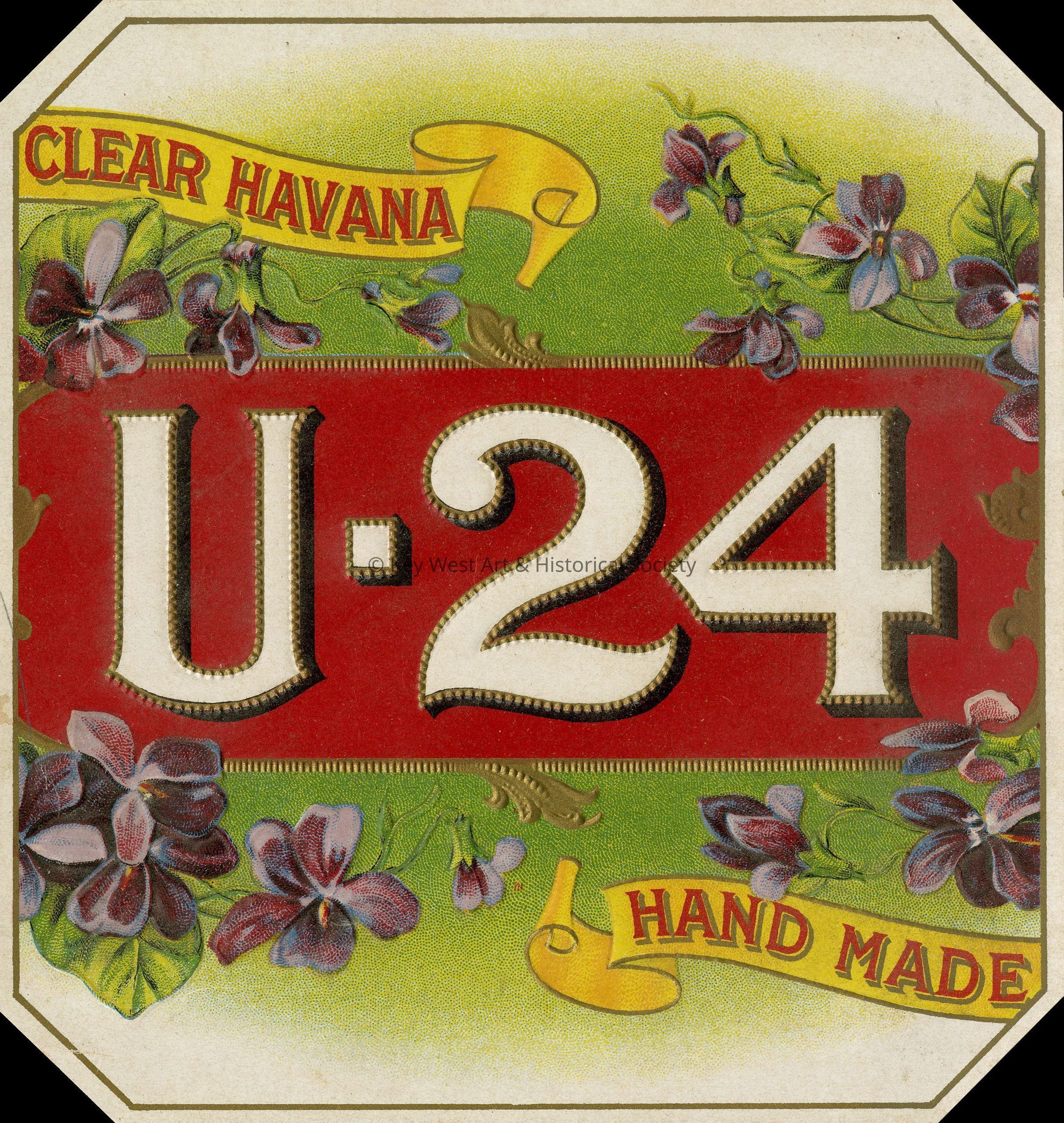 Full color lithograph outer cigar box label promoting U-24 cigars from the Manuel Menendez Factory. Likely taken from a sample book produced by the lithographer.Type of Print