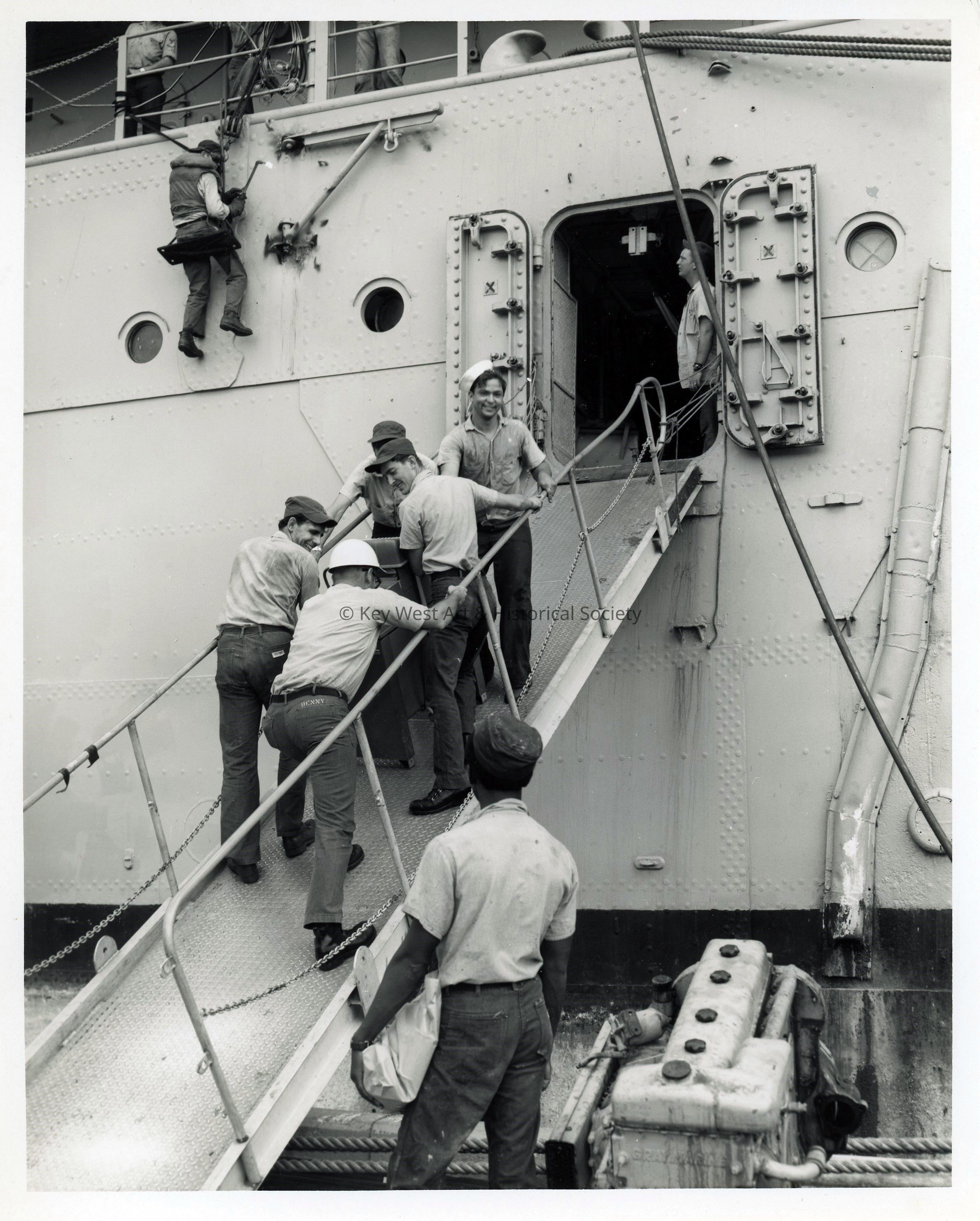 Black and white photograph of U.S. Navy personnel carrying supplies aboard an unknown ship at Naval Station Key West. A welder is also visible making repairs.