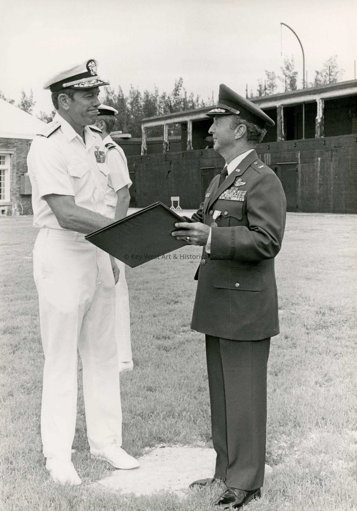 Black and white photograph of an unknown U.S. Army Brigadier General and an unknown U.S. Navy Rear Admiral at Fort Zachary Taylor.