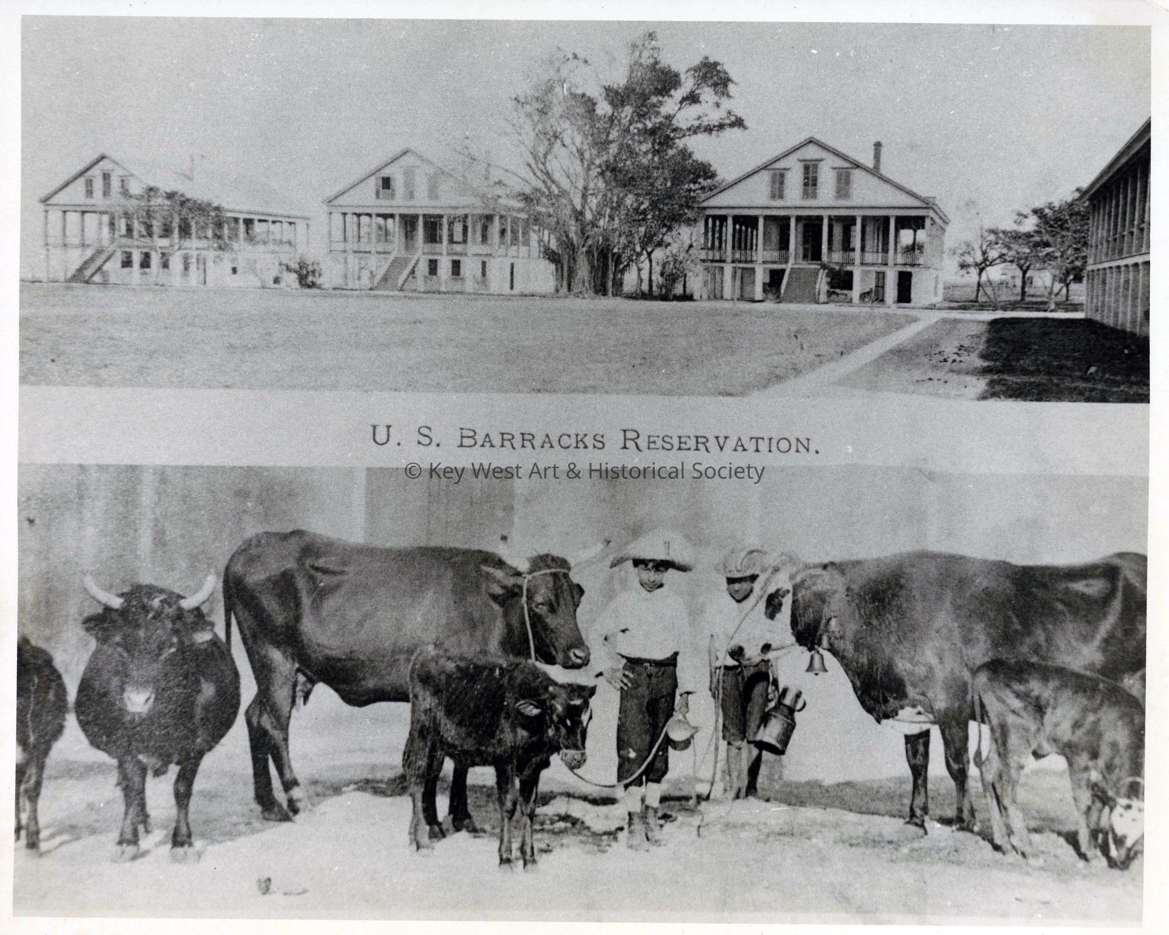 Black and white photograph showing two different views of Key West. The top photograph features the U.S. Army Barracks and the below is fresh milk on the hoof.