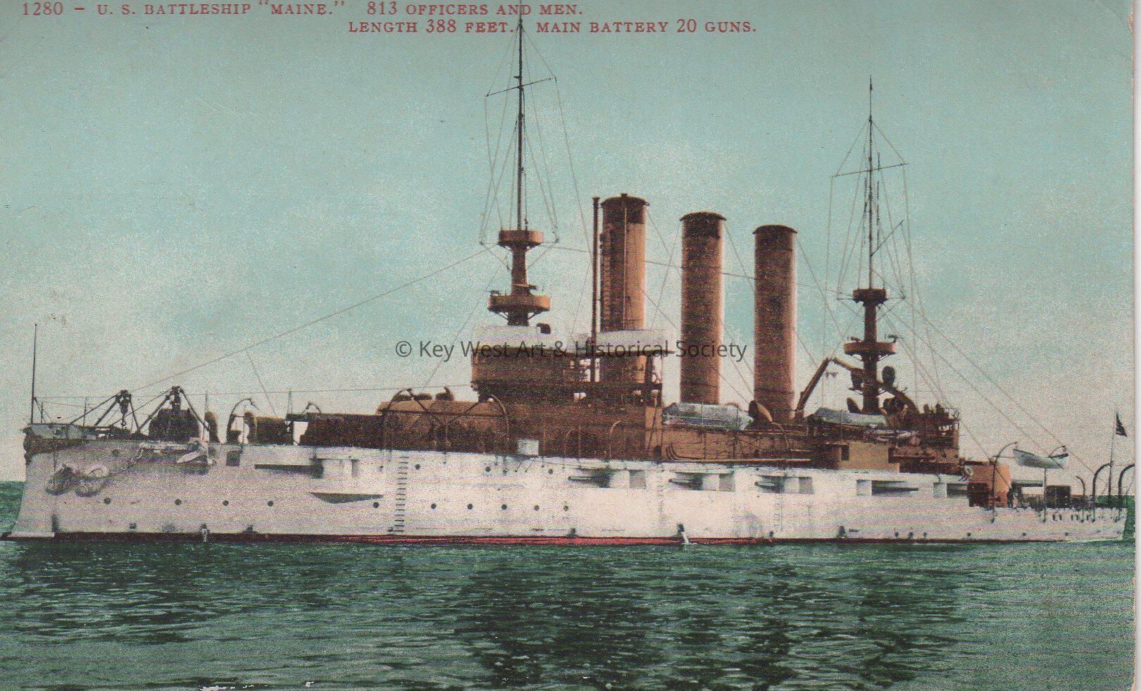 Postcard depicting the Battleship U.S.S. MAINE. The caption reads, ‘U.S. Battleship “Maine” 813 Officers and Men. Length 388 feet. Main Battery 20 guns.‘Collection