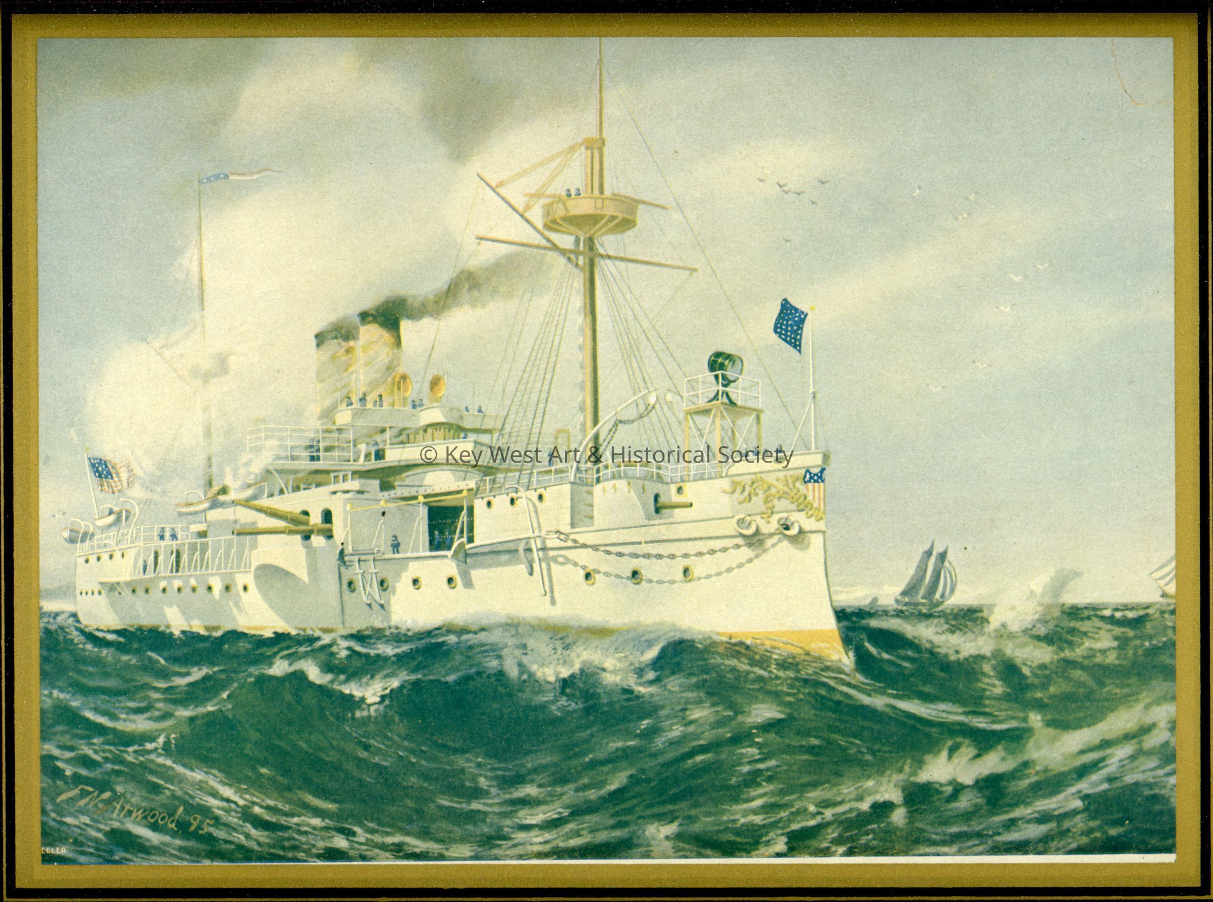 Framed colored print of the USS MAINE titled "U.S. Maine 6682 Tons 9293 H.P." by F.N. Atwood.Collection