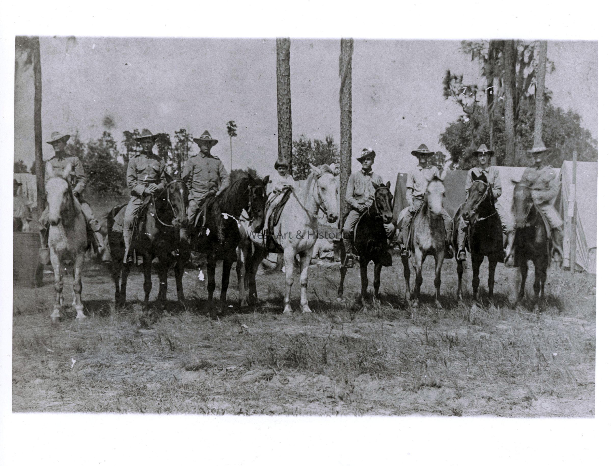 Black and white photograph of members of the US Cavalry mounted on horses while in Key West.