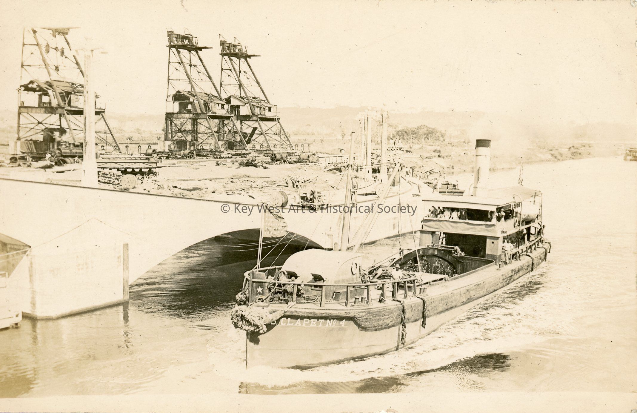 Black and white photograph postcard depicting the dredging boat named U.S. Clapet No. 4 (four). Used during construction of the Panama Canal, this dredge was taken and used by the United States Navy during World War I. The vessel was returned after the war. The postcard is addressed to Mrs. Geo. A. Balling.Subject