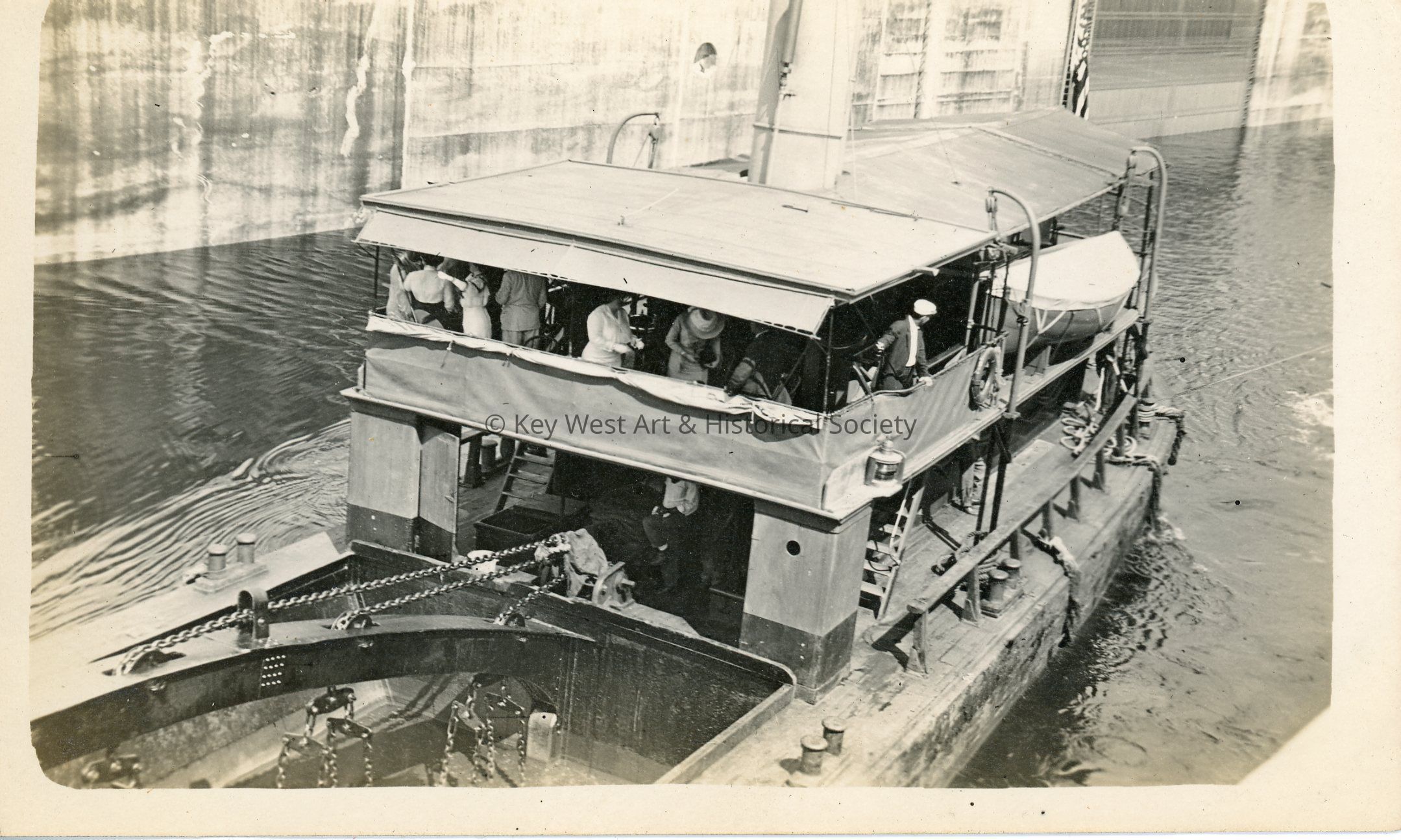 Black and white photograph depicting the dredging boat named U.S. Clapet No. 4 with passengers. Used during construction of the Panama Canal, this dredge was taken and used by the United States Navy during World War I. The vessel was returned after the war. The photograph was designed to be attached to a postcard backing.
