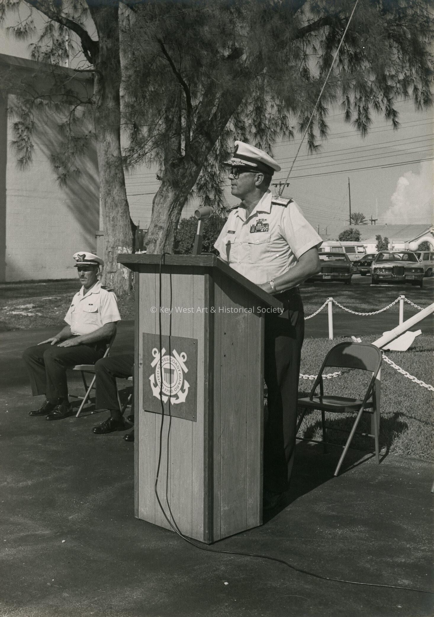 Black and white photograph of a U.S. Coast Guard Change of Command Ceremony.Photograph Details