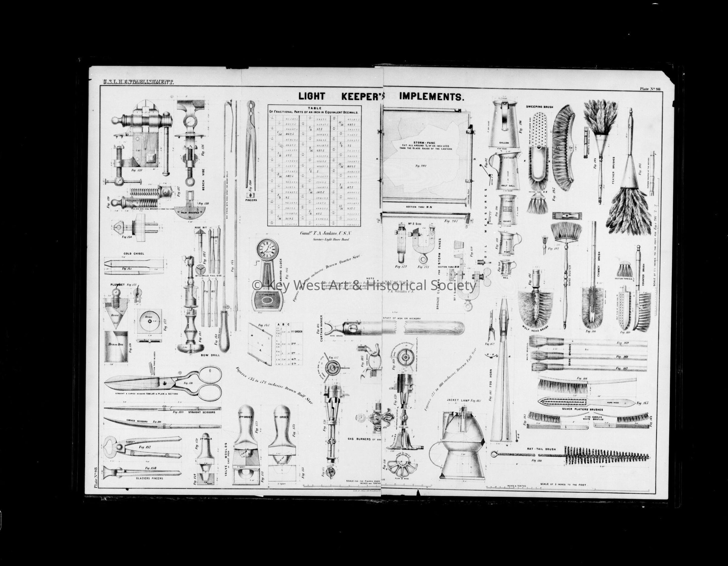 Black and white negative showing several tools used by Lighthouse Keepers employed by the U.S. Lighthouse Establishement.