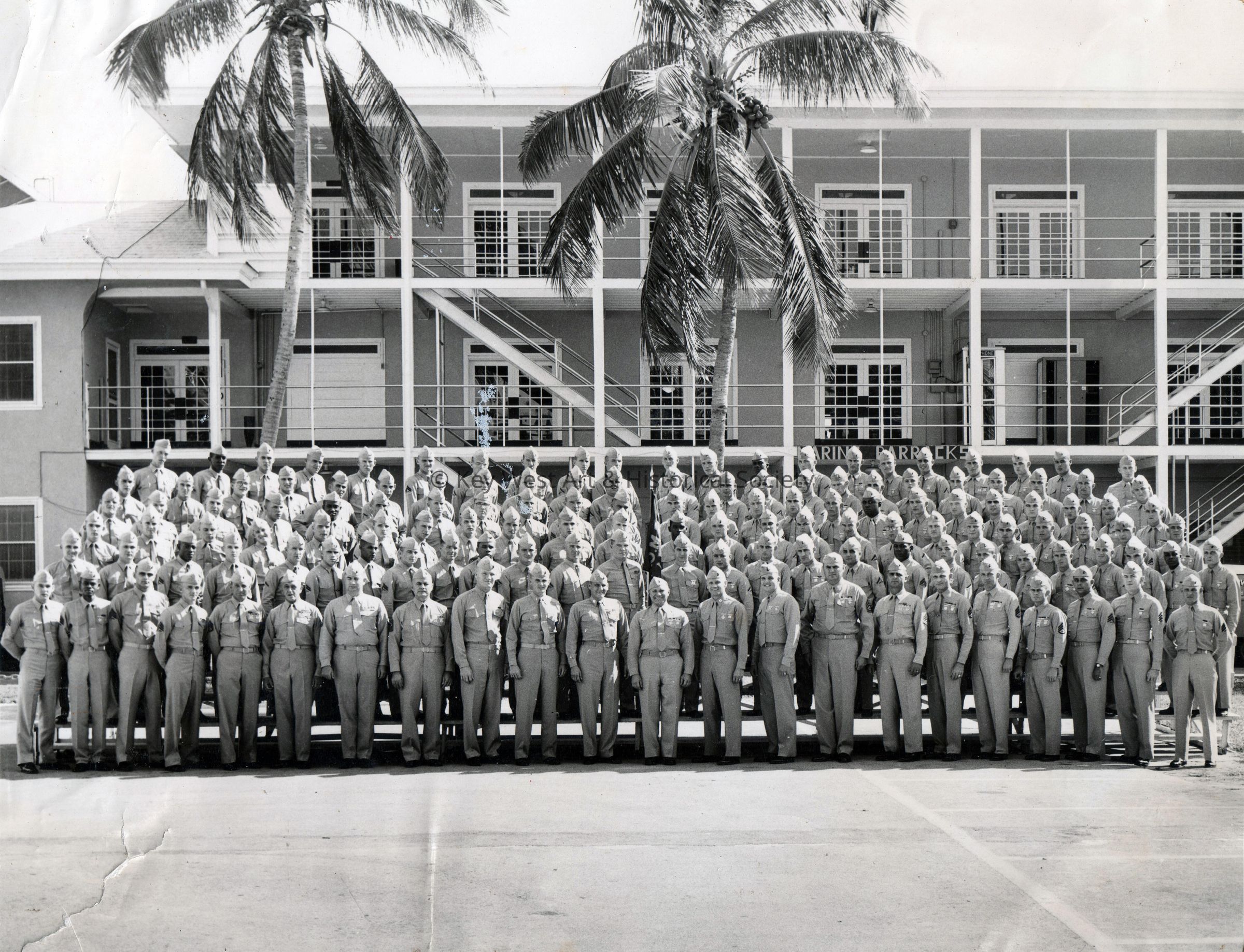 Black and white photograph of U.S. Marines outside the Marine Barracks at Naval Station Key West.