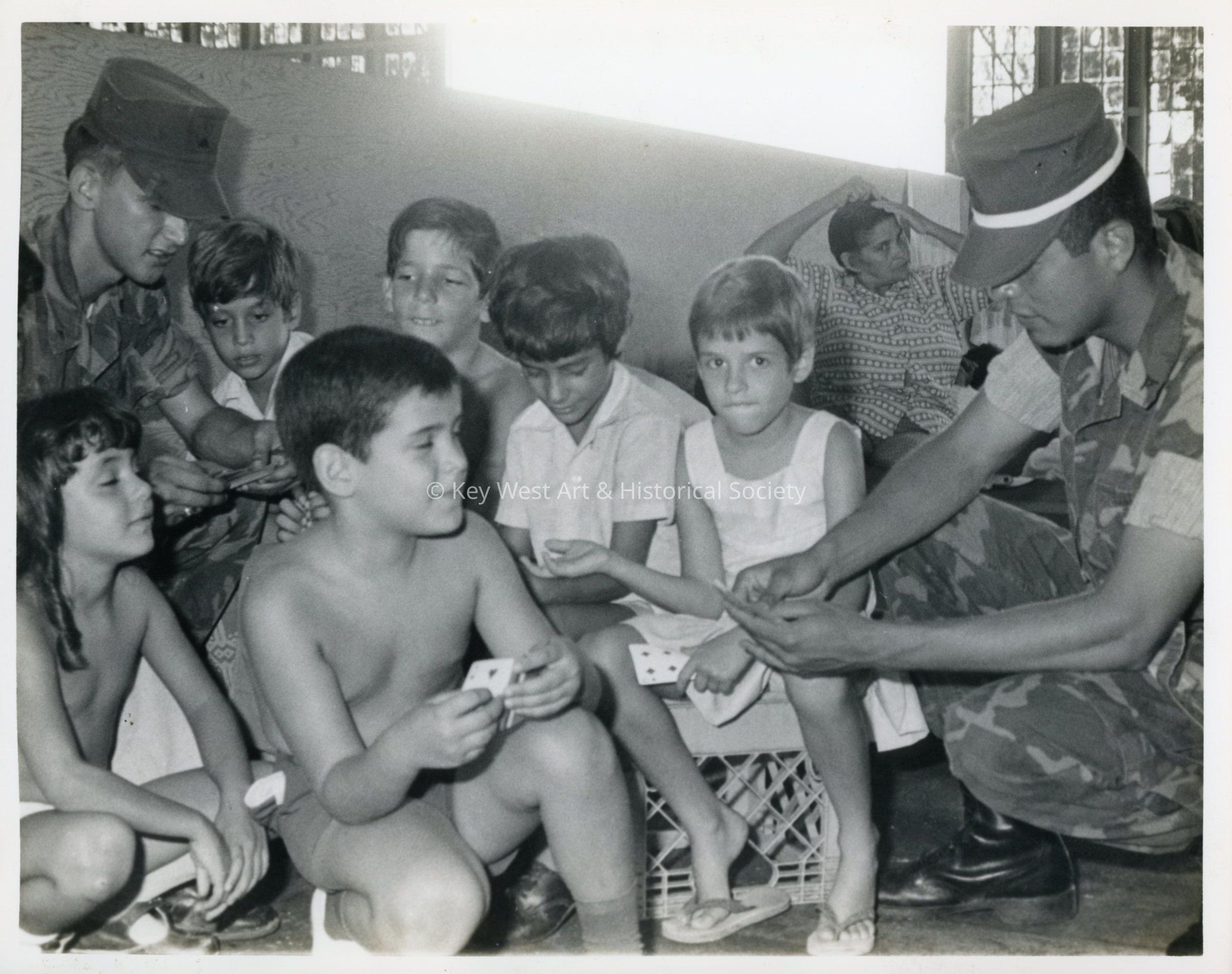 Black and white photograph of a U.S. Marines from Camp Lejeune entertaining young Cuban refugees waiting for relatives from Miami to gather them at Trumbo Point Annex, NAS Key West.