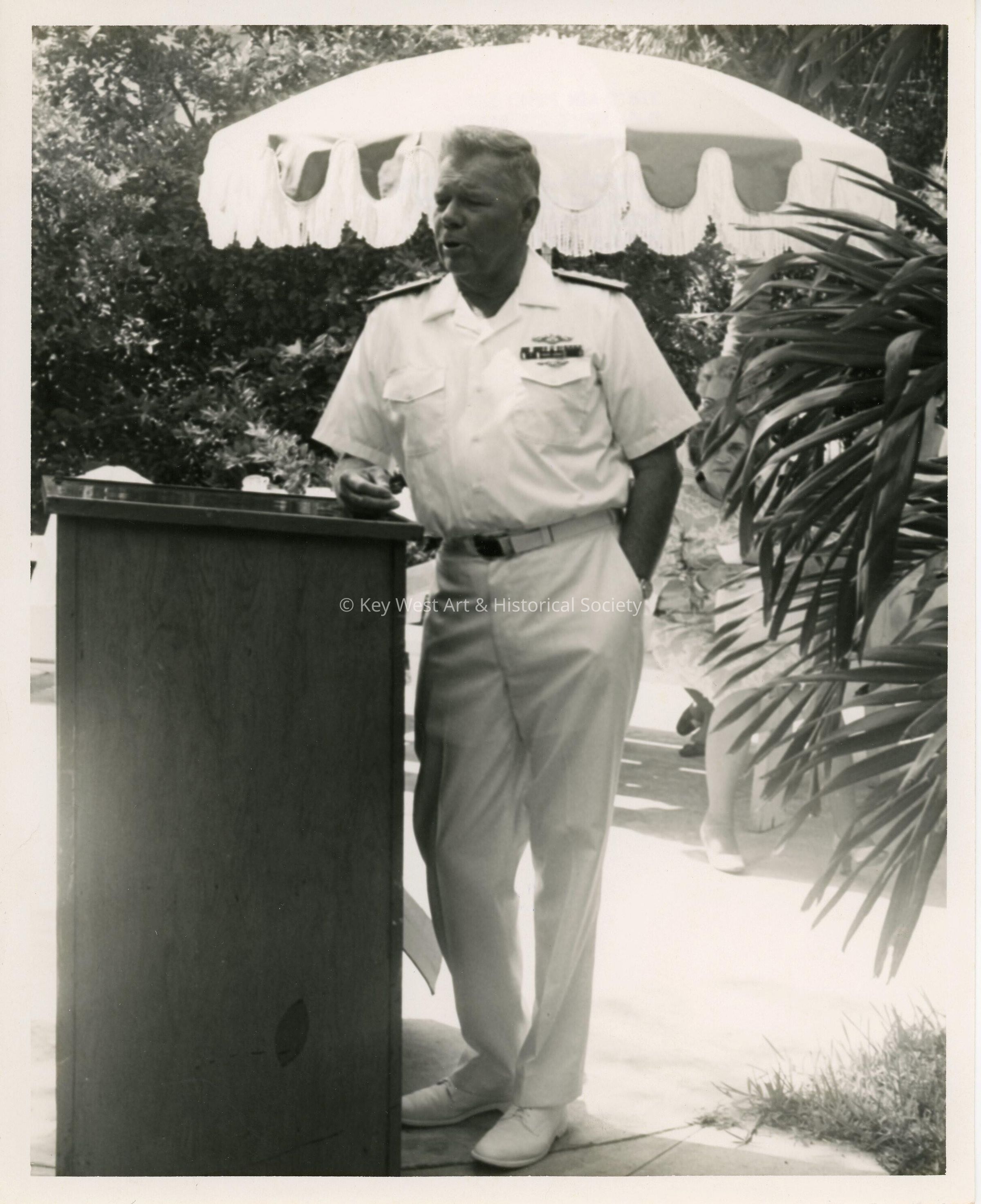 A Military man leaning against a podium