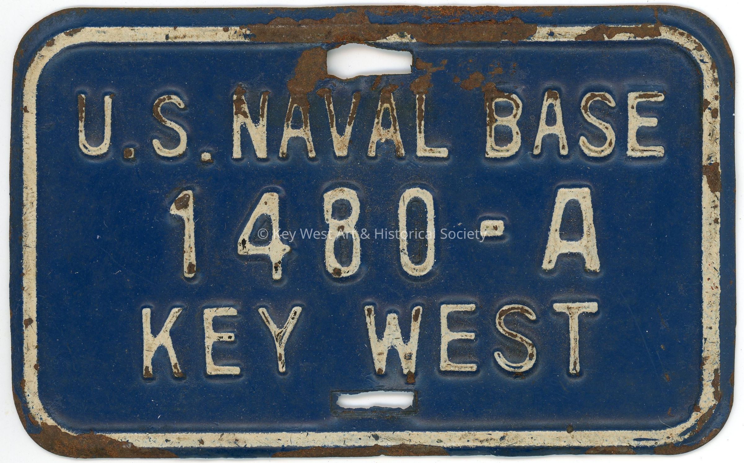 Small metal bicycle license plate issued by Naval Station Key West for use on base. The license plate is blue with white text and border line and has number '1480-A'.