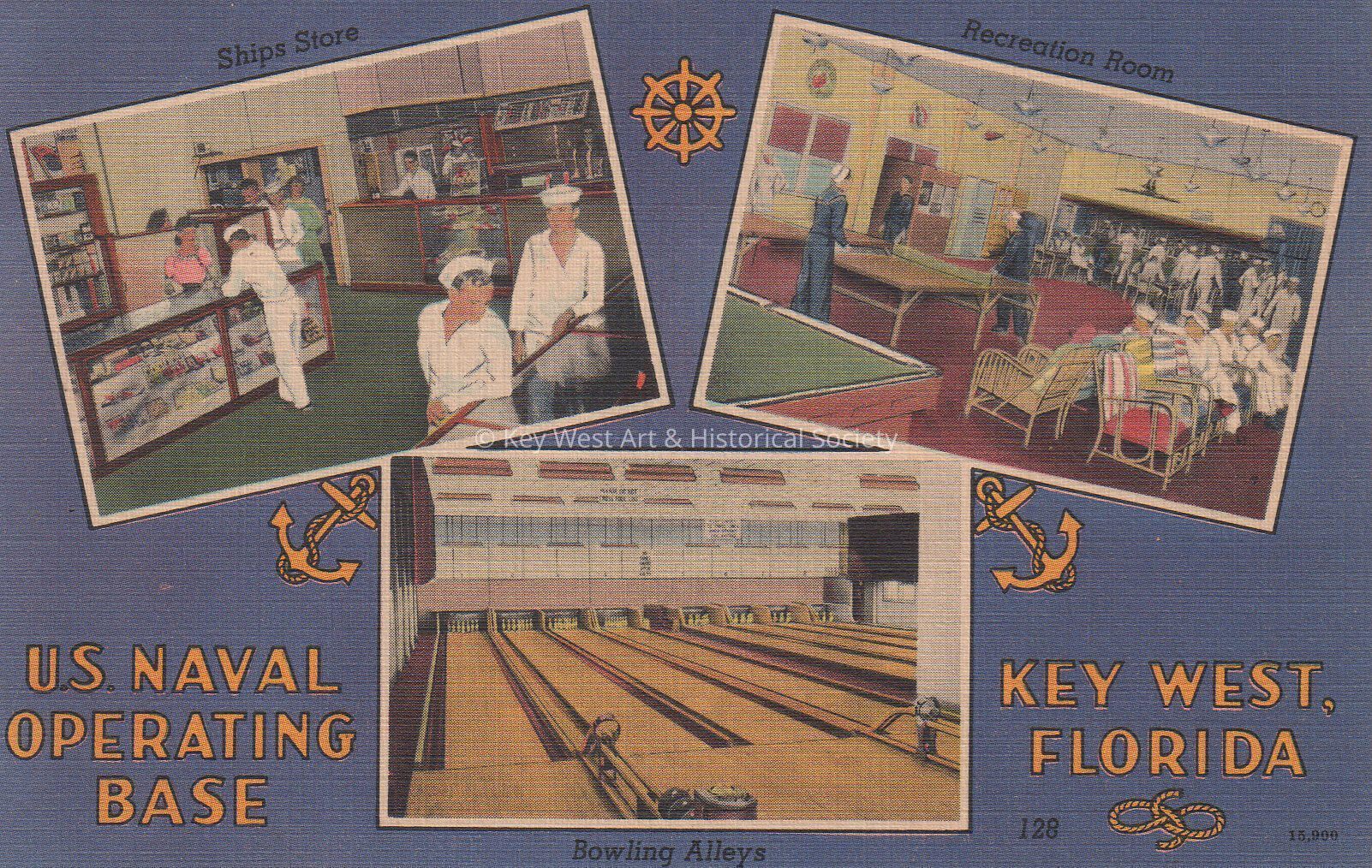 Postcard depicting three views of sailors and a bowling alley. The caption reads, ‘U.S. Naval Operating Base, Key West, Florida: Ships Store, Recreation Room, Bowling Alleys’.Collection