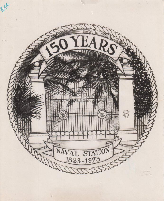 A drawing by 'England' of the U.S. Naval Station gates in Key West, with a banner reading 150 years.Photograph Details