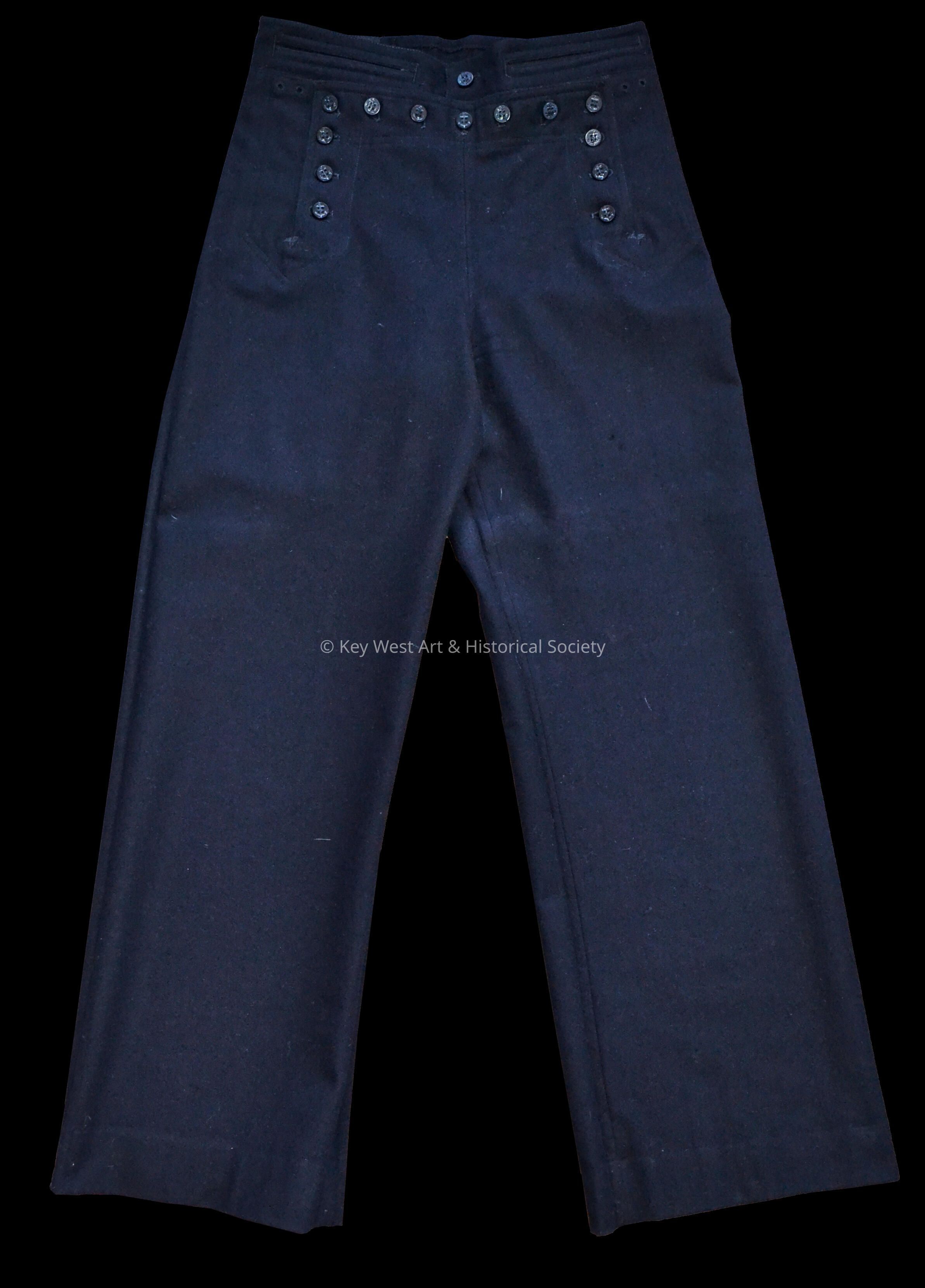 U.S. Navy World War II wool 13-button uniform pants formerly belonging to William E. Davis. During the war, Davis served as a Motor Machinist's Mate, 2nd Class, and was stationed in the Caribbean on a small submarine-hunting boat.Collection