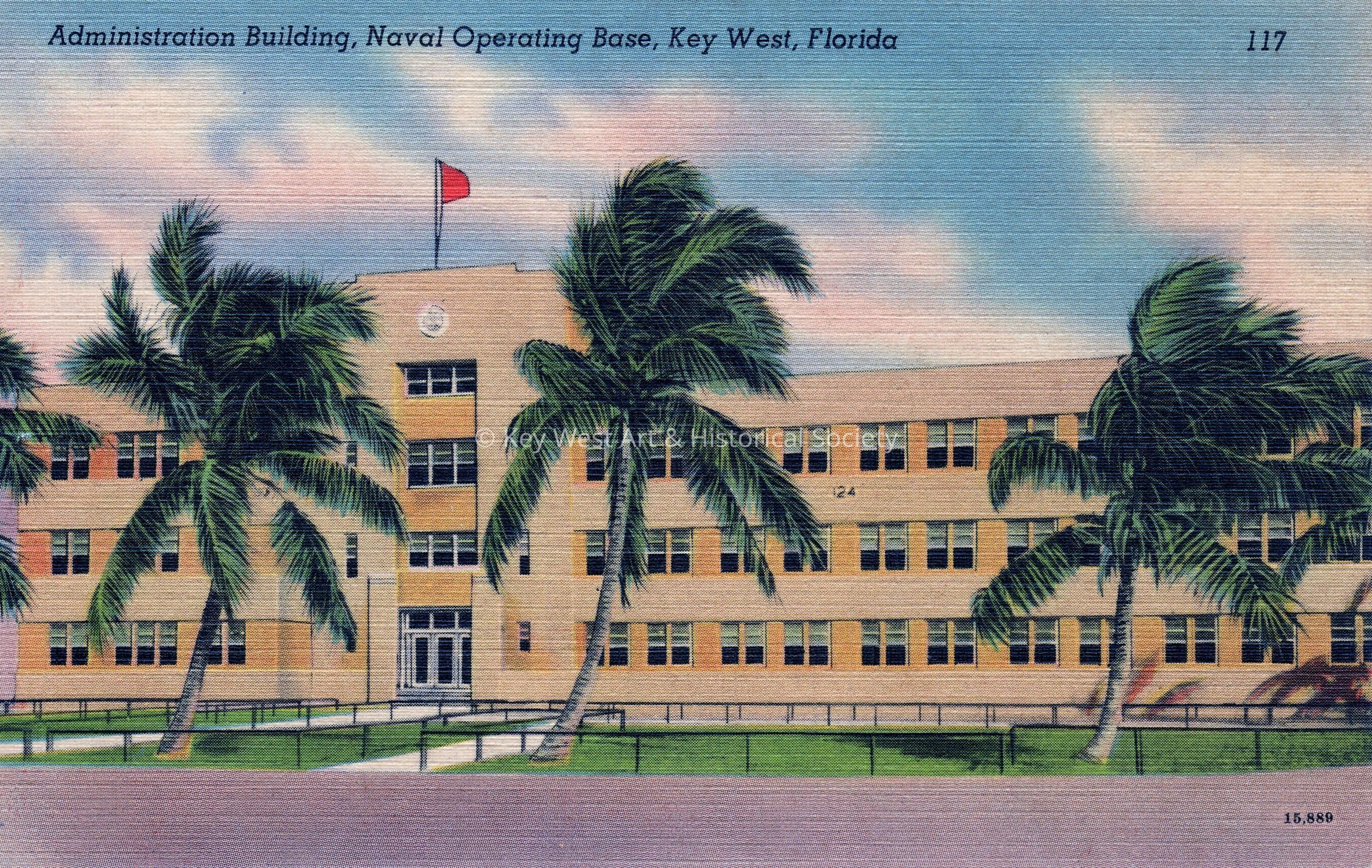 Postcard depicting the U.S. Navy Administration Building and palm trees. The caption reads, ‘Administration Building, Naval Operating Base, Key West, Florida’.Collection