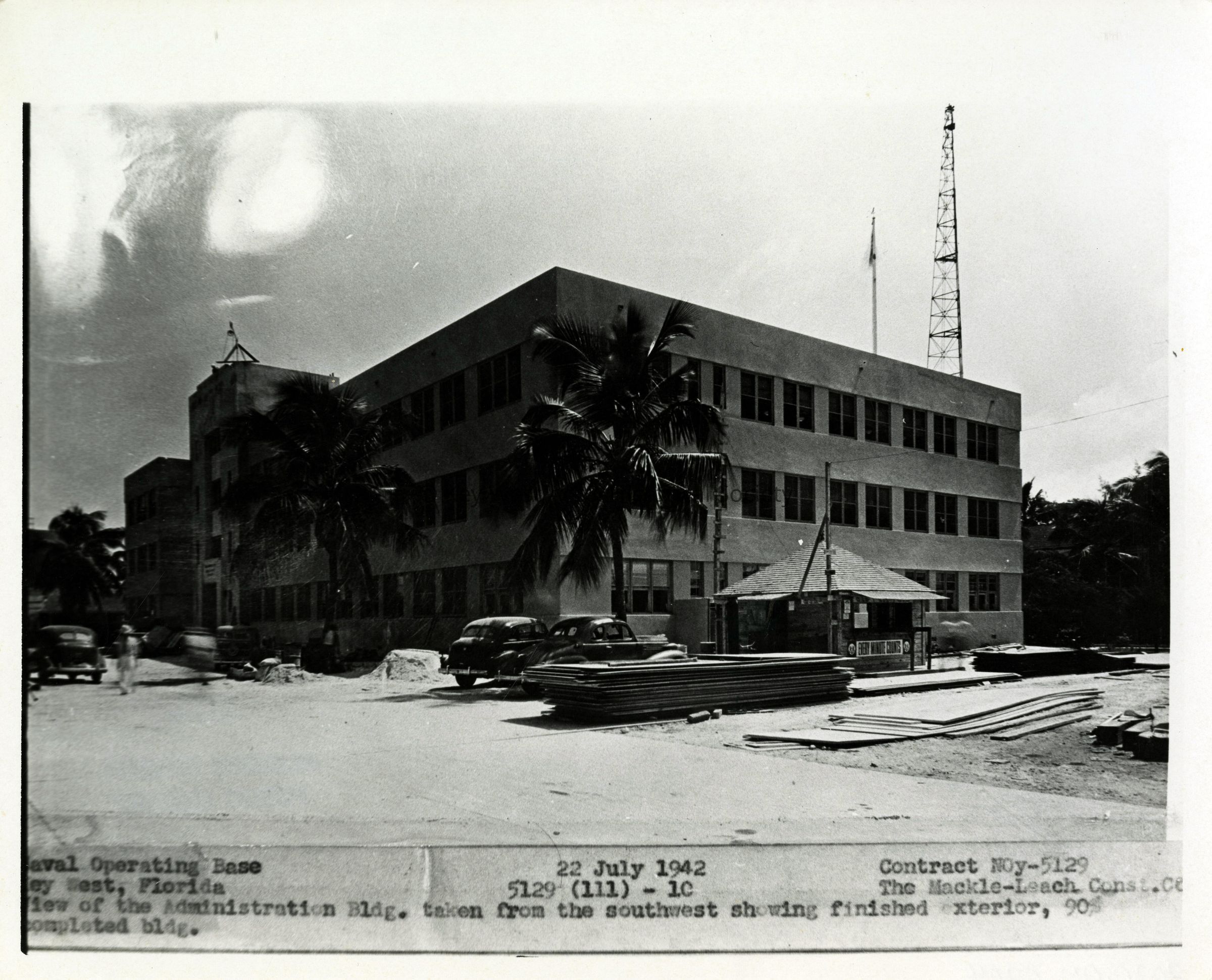 Black and white photograph of the U.S. Navy Administration building under construction at Naval Station Key West during World War II.