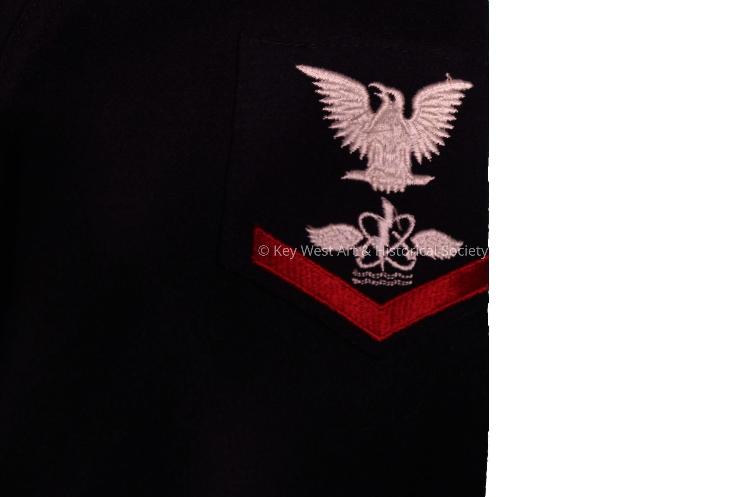 Wool, U.S. Navy Aviation Warfare dress blue uniform top. Insignia and one (1) red chevron on upper left arm. White piping around arm cuffs and back flap.