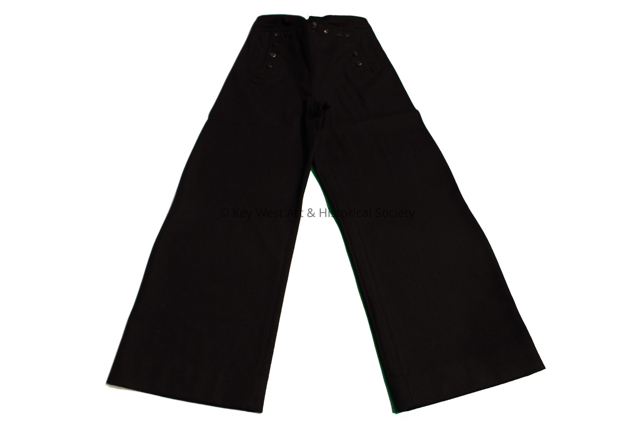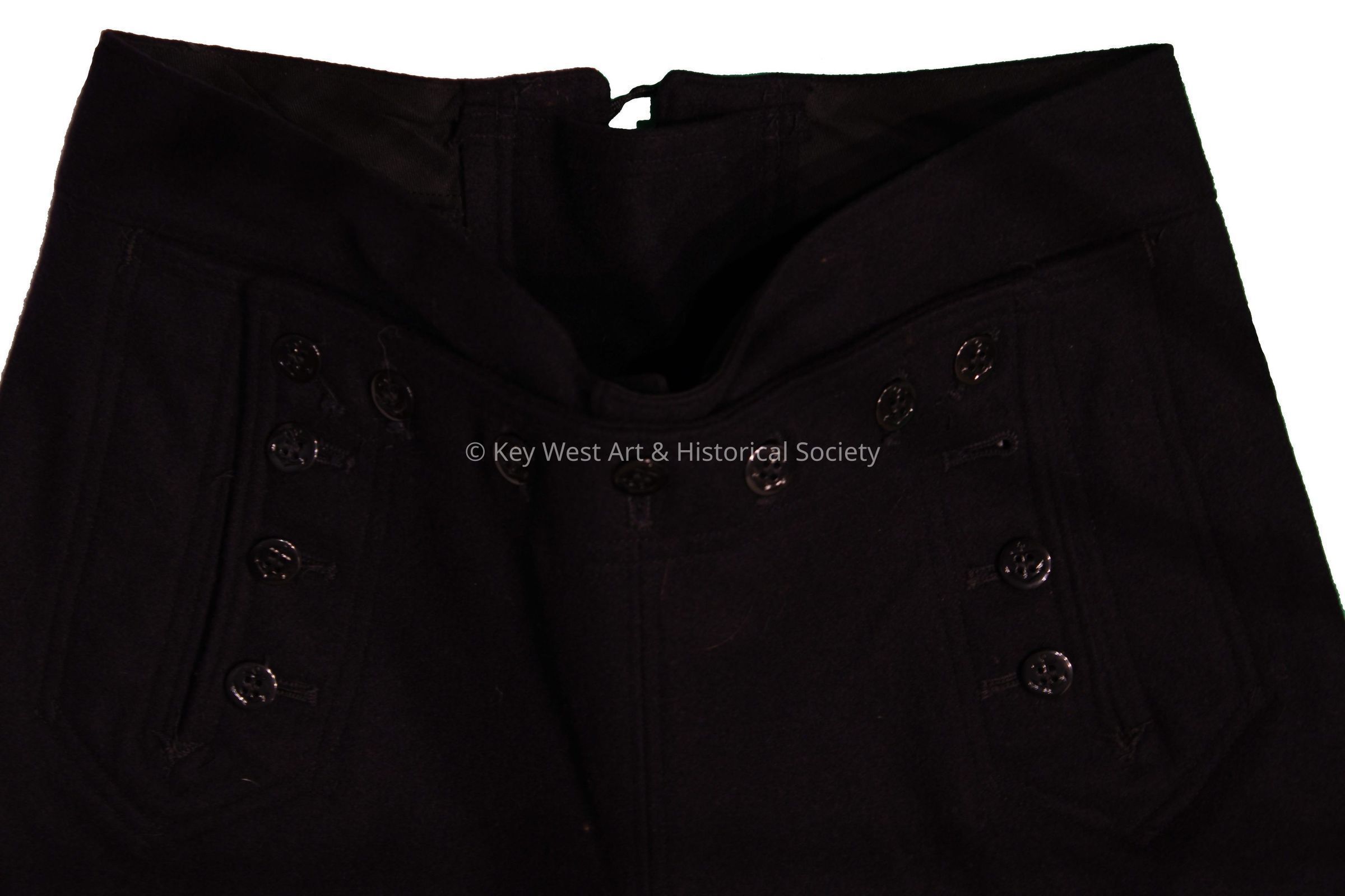 U.S. Navy Aviation Warfare dress blue wool uniform bottoms. Thirteen button front opening and tie closure in the back.