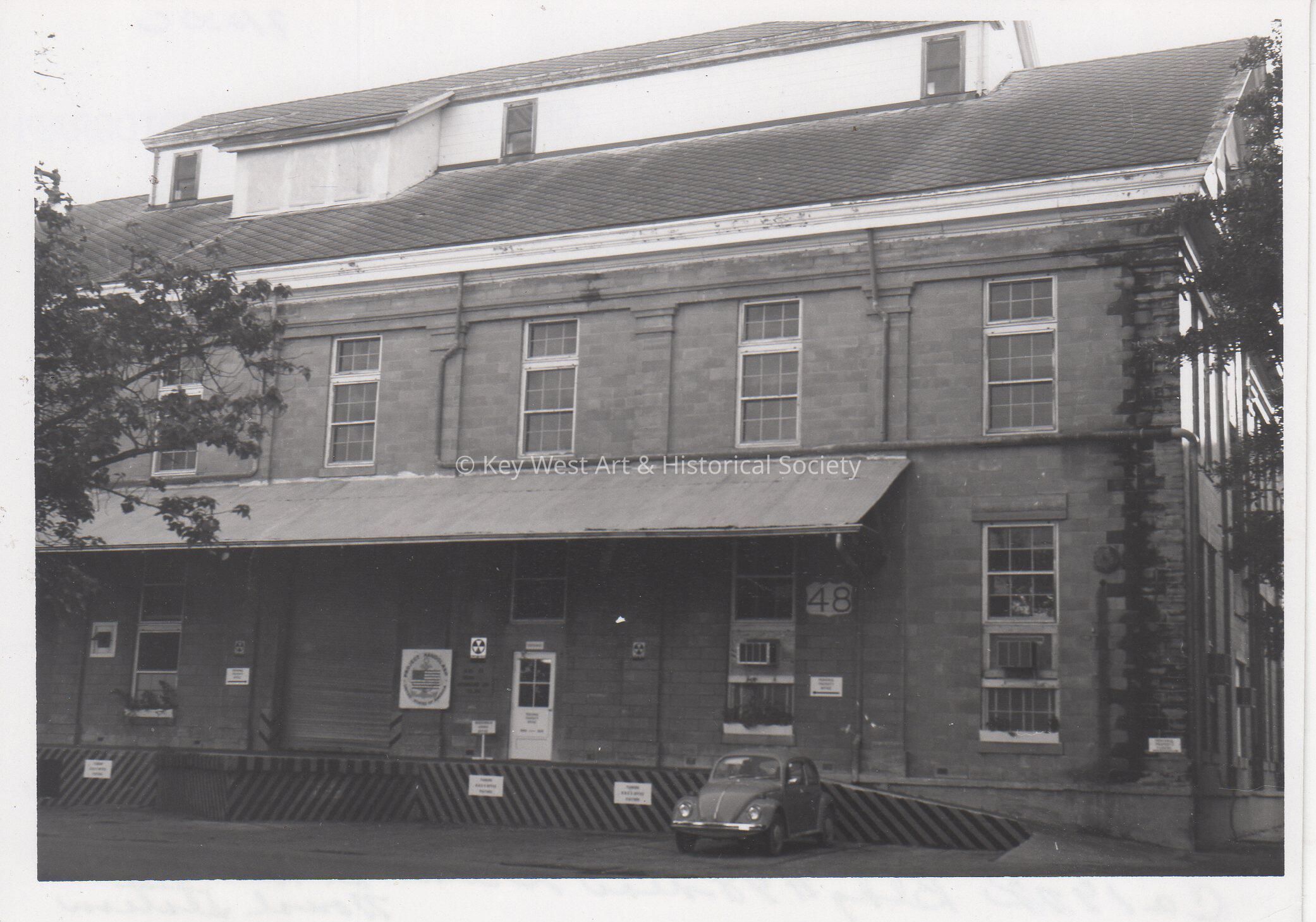 Black and white photograph of Building #48 (now Mel Fisher Museum) belonging to Naval Station Key West. The building was located near the Greene Street Entrance Gate.
