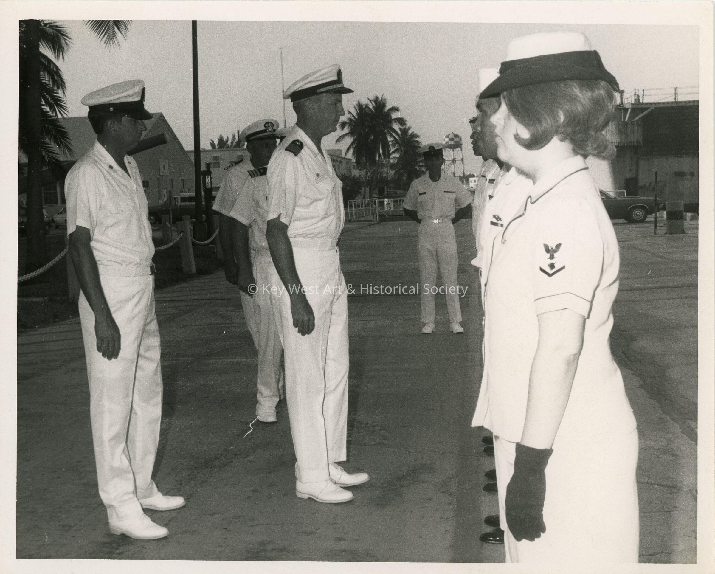 Black and white photograph of Captain Hugh Murphree (center) at Naval Station Key West. Captain Murphree's final duty was as Commanding Officer of Naval Station Key West from June 1972 until it was decommissioned on 31 March 1974. He retired from the Navy on 1 July 1974.