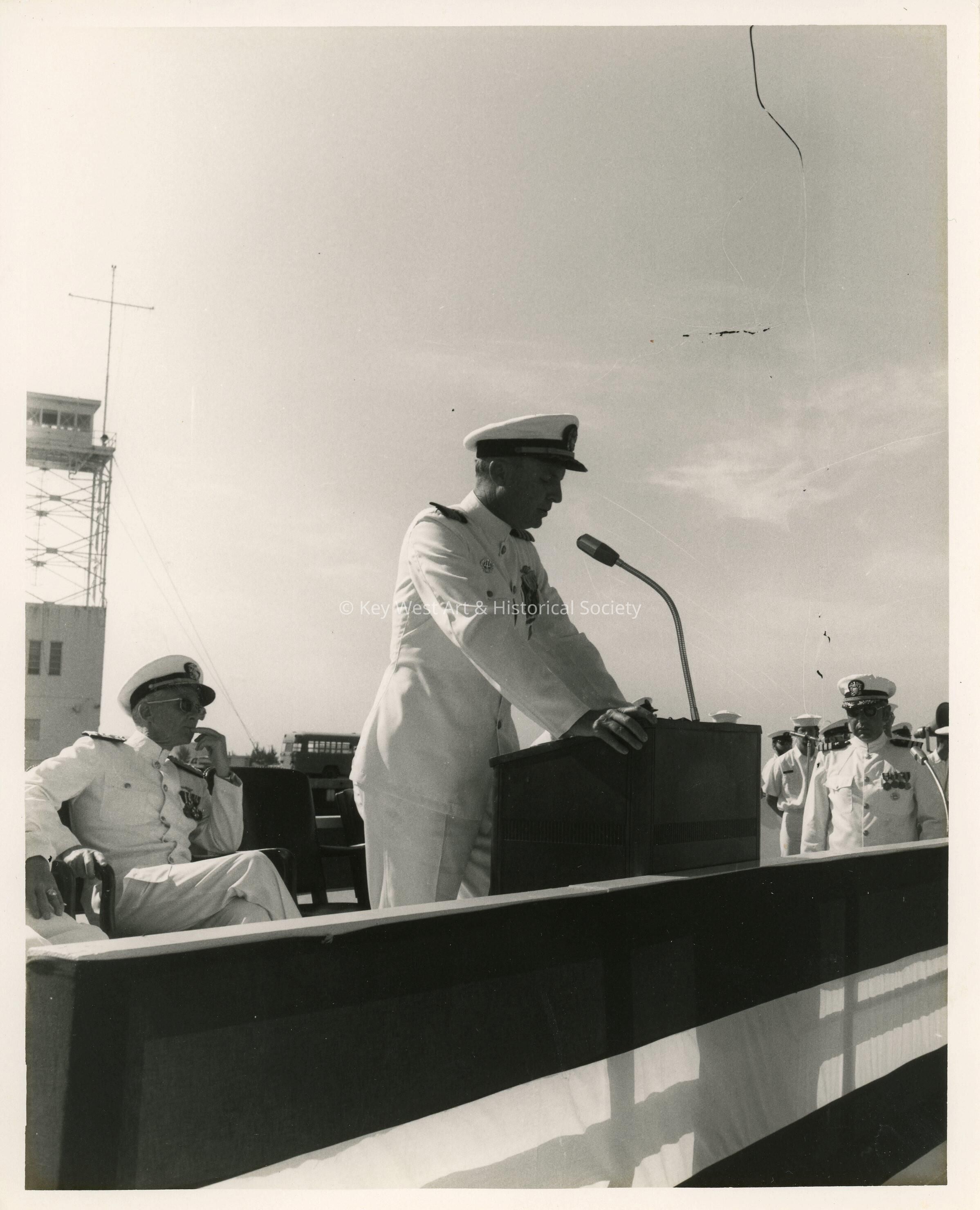 Black and white photograph of Captain Hugh Murphree at Naval Station Key West. Captain Murphree's final duty was as Commanding Officer of Naval Station Key West from June 1972 until it was decommissioned on 31 March 1974. He retired from the Navy on 1 July 1974.