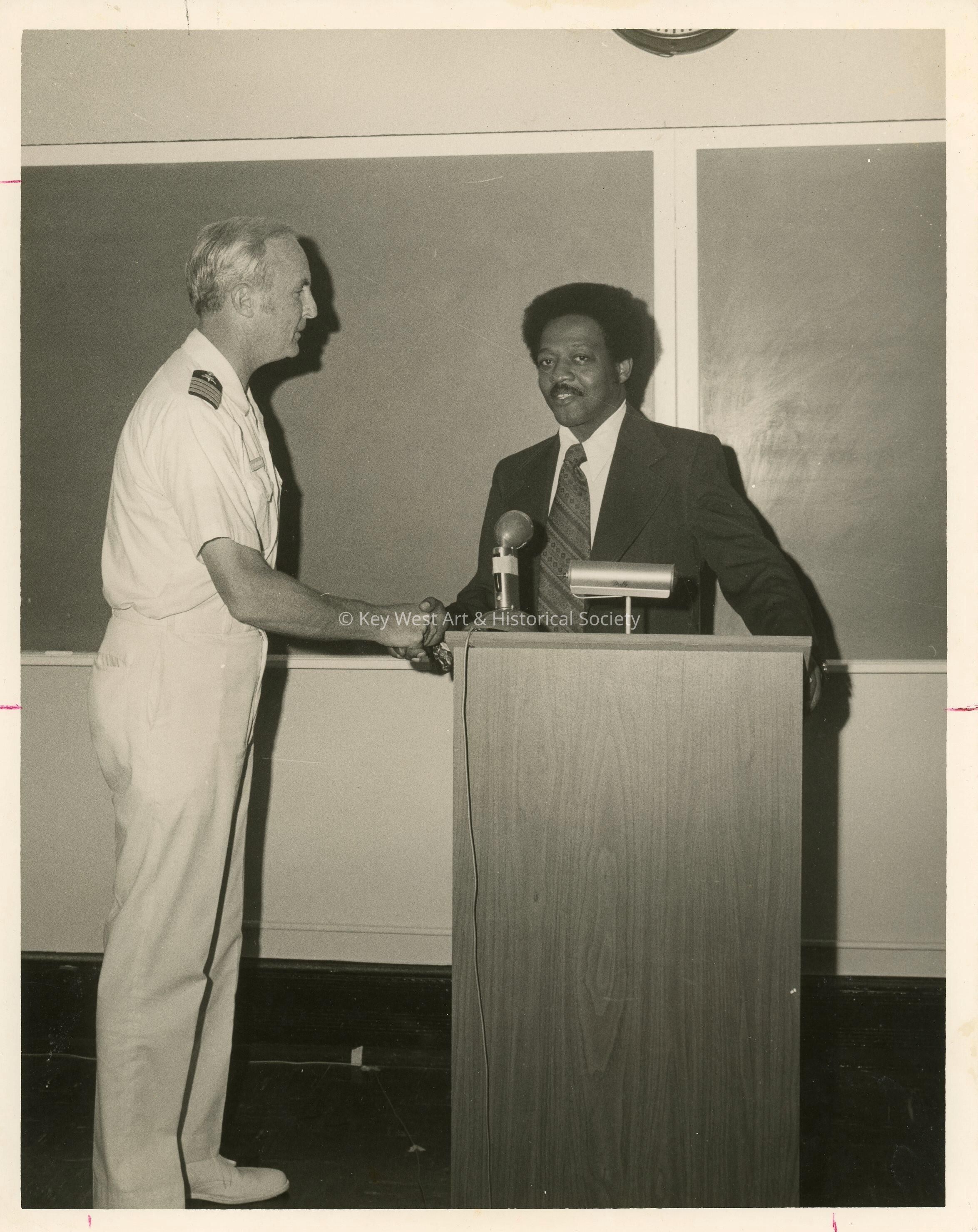 Black and white photograph of Captain Hugh Murphree (left) at Naval Station Key West. Captain Murphree's final duty was as Commanding Officer of Naval Station Key West from June 1972 until it was decommissioned on 31 March 1974. He retired from the Navy on 1 July 1974. U.S. Navy awards ceremony at Naval Station Key West
