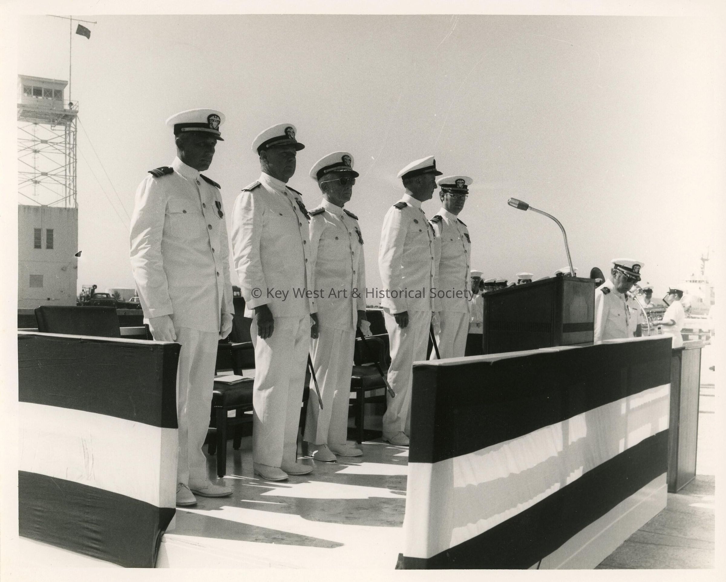 Black and white photograph of Captain Hugh Murphree at a ceremony at Naval Station Key West. Captain Murphree's final duty was as Commanding Officer of Naval Station Key West from June 1972 until it was decommissioned on 31 March 1974. He retired from the Navy on 1 July 1974.