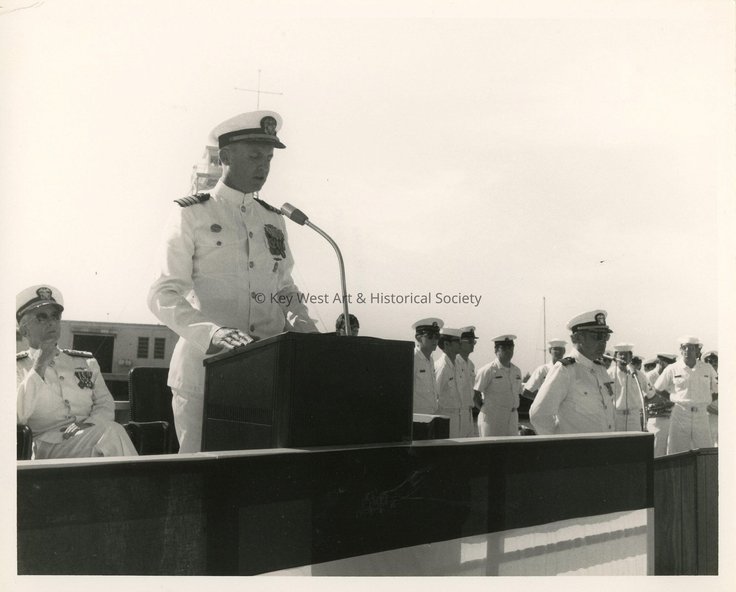 Black and white photograph of Captain Hugh Murphree at Naval Station Key West. Captain Murphree's final duty was as Commanding Officer of Naval Station Key West from June 1972 until it was decommissioned on 31 March 1974. He retired from the Navy on 1 July 1974.