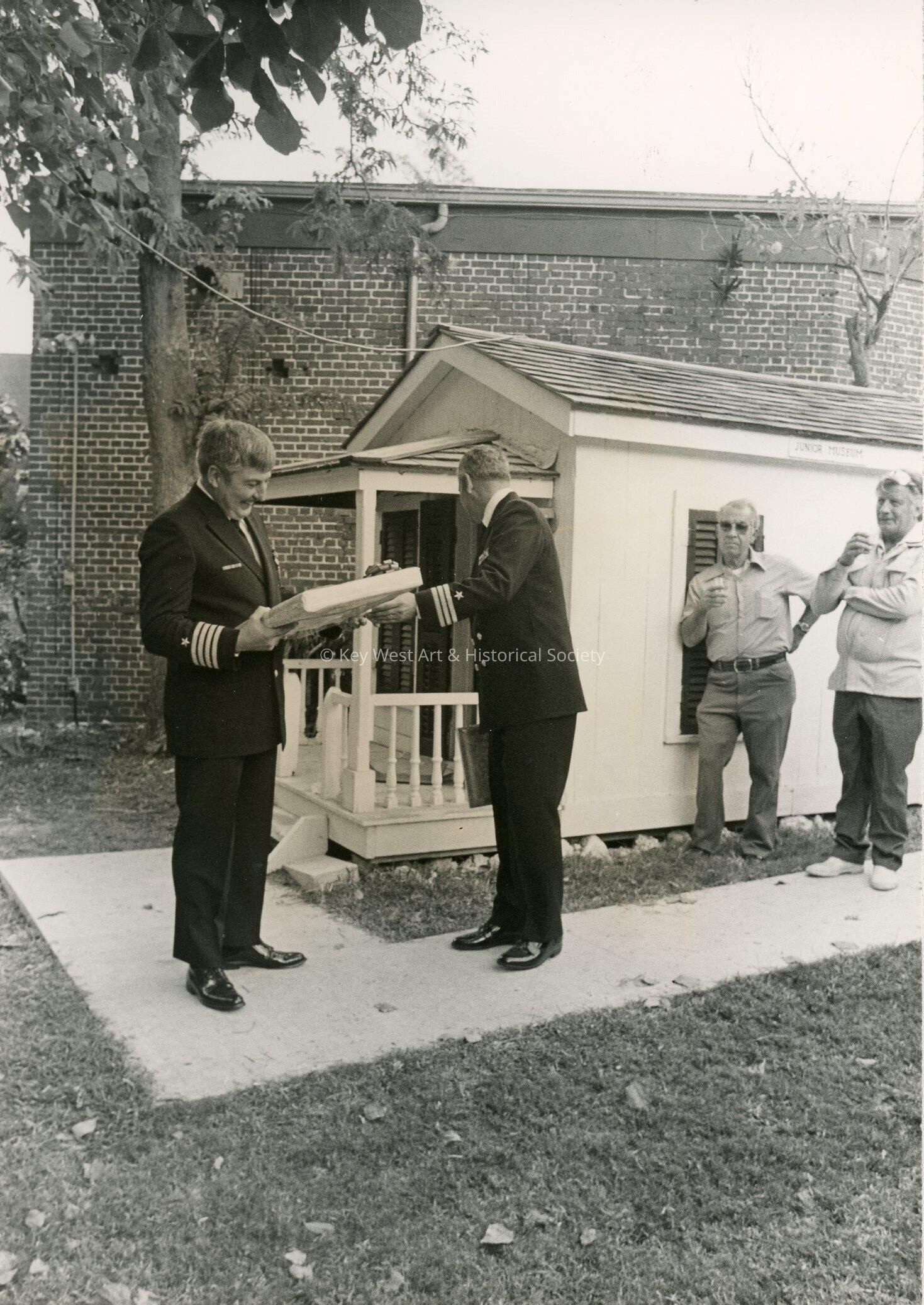 Black and white photograph of a U.S. Navy ceremony at Fort East Martello Museum.
