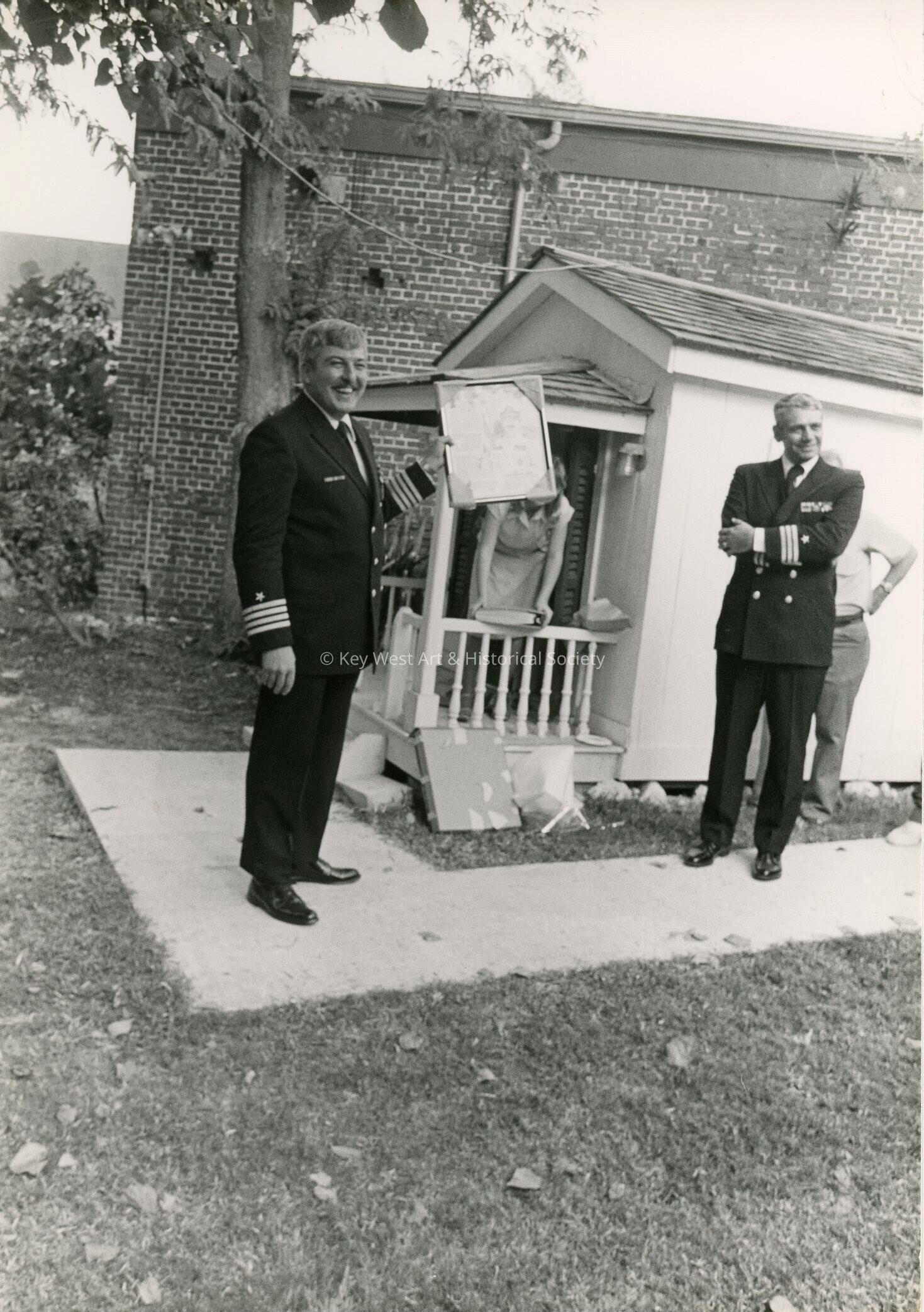 Black and white photograph of a U.S. Navy ceremony at Fort East Martello Museum.