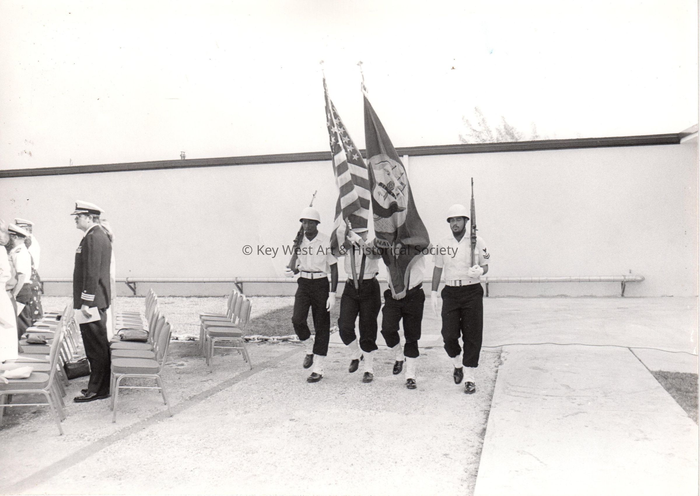 Black and white photograph of the U.S. Navy Color Guard at Naval Station Key West.