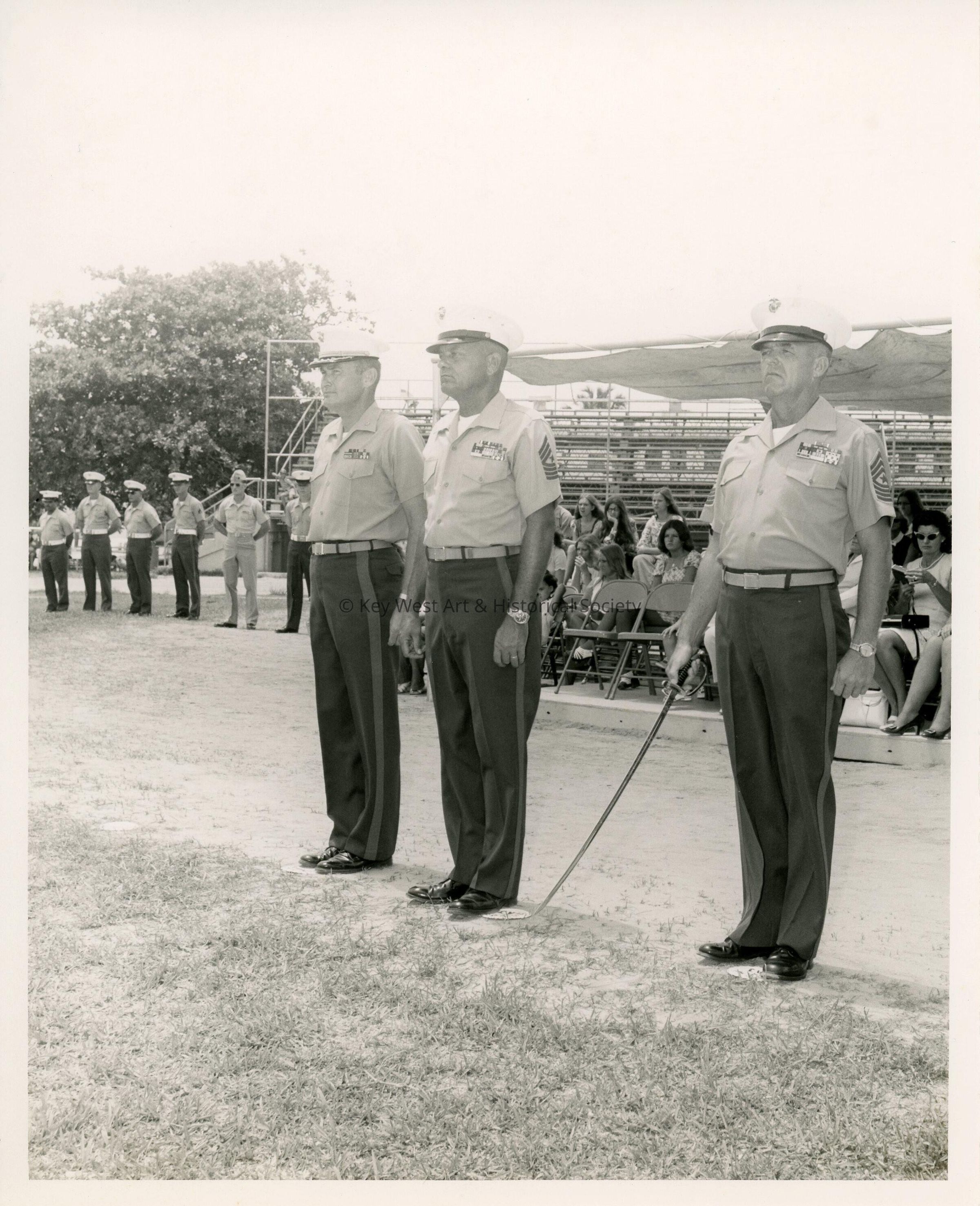 Three U.S. Navy men standing at attention at Naval Station Key West.