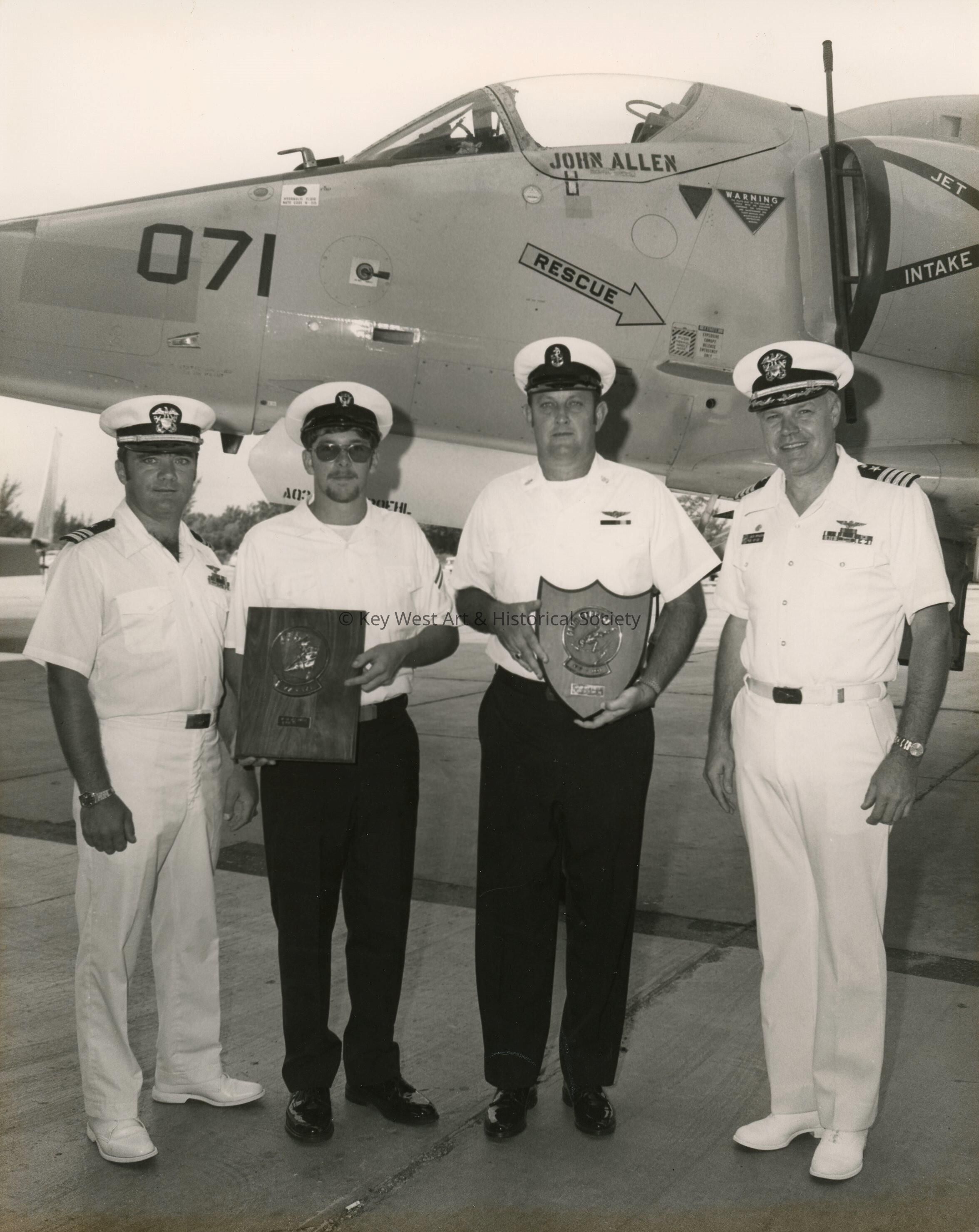 U.S. Navy men next to a jet holding plaques