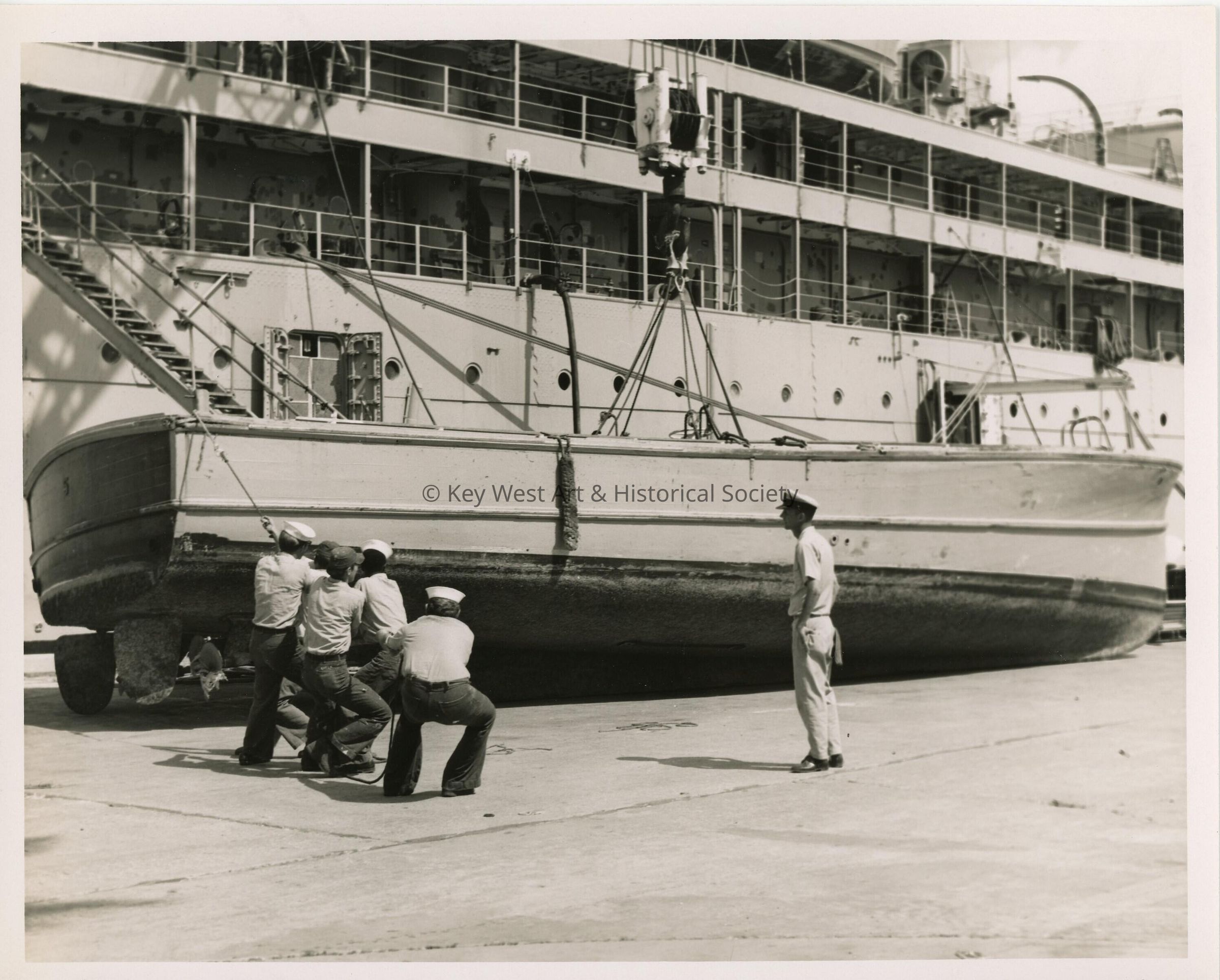 U.S. Navy men pulling a launch on Naval Station Key West.